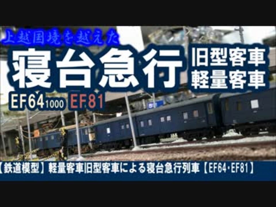 いつもはyoutubeに投稿しています。<br><a href="https://www.youtube.com/channel/UChOCIqvXxA6N34gUC2D5O9A" target="_blank" rel="noopener nofollow">https://www.youtube.com/channel/UChOCIqvXxA6N34gUC2D5O9A</a><br><br>特定番号の車輌や編成でセット販売されているご時勢に、雰囲気で組成した列車を動画にしてアップするのに躊躇いがある小心者です。もらい物やアッセンブリーで組成した軽量客車と旧型客車を、中高学生の時に購入した電気機関車で牽引させて、上野駅から上越国境を越えて羽越方面へ抜ける寝台車付き急行列車を仕立ててみました。時代や編成構成は大雑把に雰囲気で捉えたものですのでご了承ください。<br><br>80年代生まれの当局には比較的新しい電気機関車であるEF64-1000と旧型客車の組み合わせは、一週回って新鮮に感じます。そりゃ、電気暖房用の装置を搭載していますから、なんら可笑しな事ではありませんが、EF58やEF57と比べると、やはりどこか不思議な気持ちになります。昭和58年頃までは見られた光景でしたっけ。荷物車が貨車然としたスニ44に変わっていたりして、旧型客車の編成もどこかしら古い時代と新しい時代とでぎっちょな雰囲気を漂わせていたようですね。<br><br>時代に合わせてウェザリングも煤汚れ偏重かサビ汚れ偏重か変わるところですが、蒸気機関車も持っている当局としては汎用性を持たせて煤汚れもまぁまぁ強いウェザリングとなってしまいます。特定番号特定編成であれば、そのセットの考証年次に合わせる事が出来て楽ではあるんですけどね。<br><br>アッセンブリーで入手したオハ47には種別サボや行き先サボが印刷されていて、とてもカッコイイですね。普通列車のために購入したので余計かなと思っていたのですが、とんでもなかったです。急行には必要でしたし、暗い青の車体色に赤と白のアクセントが編成中にとっても映えます。指定席の薄緑色もステキです。他の車輌にもキハ58「いいで・ざおう」セットの余ったシールを貼りたくなします。便所窓の白色も緻密感が出ていいですね。<br><br>動画は、上野を出発して高崎線を駆けるEF64-1000と、新津から羽越線を駆けるEF81を副題に据えました。新津で荷物車2両が減車されるそうで、動画でも減車しました。タイトルに入れませんでしたが一応、オロネの位置的に急行鳥海をイメージしています。スニ41じゃありませんが。というか編成の向き上野行きですね・・・。<br><br>KATO 旧型客車・軽量客車各種<br>KATO EF64-1000<br>TOMIX EF81<br><br>撮影場所:甲府ロイヤルモデル様<br>音楽素材:砂時計に飲まれゆく/ポケットサウンド様<br><br>ウェザリング塗装がまわってしまったEF64の窓を拭かないと・・・。ワイパーの吹き跡みたいにしましょうかw