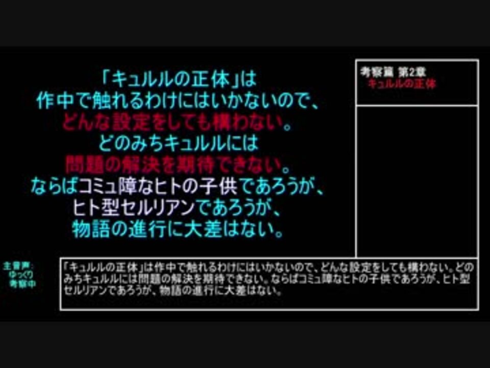 時間を埋めるつもりで作った部分が、やたらと長大になった件について。<br><br>※手っ取り早く『まとめ』を知りたい方へ → <a href="#" class="seekTime" data-seekTime="15:09" onclick="seekNicoPlayer('#15:09'); return false;">#15:09</a><br><br>【けものフレンズ2】考察篇<br><a href="https://www.nicovideo.jp/watch/sm35064284" class="watch">sm35064284</a>:(10:29)第1章 キュルル と けもフレ2のテーマ<br><a href="https://www.nicovideo.jp/watch/sm35064328" class="watch">sm35064328</a>:(16:00)第2章 キュルルの正体<br><a href="https://www.nicovideo.jp/watch/sm35064381" class="watch">sm35064381</a>:(13:35)第3章 サーバル と かばん<br><a href="https://www.nicovideo.jp/watch/sm35064426" class="watch">sm35064426</a>:(07:02)第4章 アムールトラ と 極楽コンビ<br><a href="https://www.nicovideo.jp/watch/sm35064456" class="watch">sm35064456</a>:(11:45)第5章 イエイヌ と 裏のテーマ<br><a href="https://www.nicovideo.jp/watch/sm35064499" class="watch">sm35064499</a>:(11:32)第6章 舞台設定<br><a href="https://www.nicovideo.jp/watch/sm35064533" class="watch">sm35064533</a>:(05:15)第7章 2種類のセルリアン