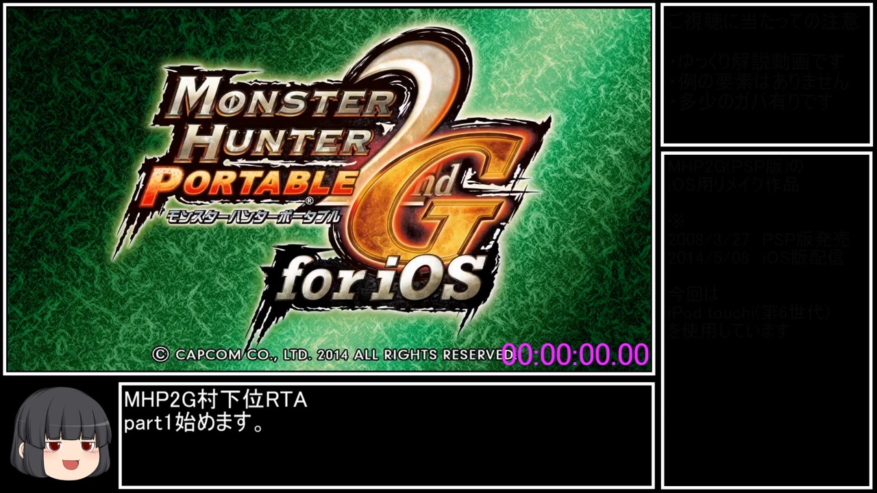 ゲーム開始 ~ イャンクック まで<br><br>次→<a href="https://www.nicovideo.jp/watch/sm35210697" class="watch">sm35210697</a><br><br>※記録更新版<br> 再走 (2'53''37)→<span style="color: #006699; font-size: 14px;"><a href="https://www.nicovideo.jp/mylist/66811789" target="_blank" rel="noopener">mylist/66811789</a></span><br> 再再走(2'29''16)→<a href="https://www.nicovideo.jp/mylist/70518914" target="_blank" rel="noopener">mylist/70518914</a><br><br>RTAマイリスト→<a href="https://www.nicovideo.jp/mylist/65730351" target="_blank" rel="noopener">mylist/65730351</a><br><span style="color: #000000; font-size: 13px;">配信時→<a href="https://youtu.be/PN3jNW7gwJ0" target="_blank" rel="noopener nofollow">https://youtu.be/PN3jNW7gwJ0</a></span><br>先駆者様→海外兄貴 <a href="https://youtu.be/KOf0Ek6FI1o" target="_blank" rel="noopener nofollow">https://youtu.be/KOf0Ek6FI1o</a><br> ftnr兄貴 <a href="https://www.nicovideo.jp/watch/sm27537701" class="watch">sm27537701</a><br> ブロリスト兄貴 <a href="https://www.nicovideo.jp/watch/sm29207083" class="watch">sm29207083</a><br><br>ルール確認<br>・「ゲームを開始しますか?」の画面で<br> 「はい」を押した瞬間にタイマースタート<br><br>・シェンガオレンを倒して「戦いに勝利した!」<br> が表示された瞬間にタイマーストップ<br><br>※現在speedrun.comに記録申請中です。<br> RTAっていろいろ要領分かっていないので、<br> 何か間違っていることがあればご指摘お願いします。<br> ↓<br>※追記:2019/06/02_18:16<br> speedrun.comにて正式な記録として認定されました!<br> <a href="https://www.speedrun.com/mhfu" target="_blank" rel="noopener nofollow">https://www.speedrun.com/mhfu</a><br> 一応world recordです。やったぜ。<br><br>※多くの方々ニコニコ広告ありがとうございます!!<br> 想像以上に反響大きくて震えている(´ω`)<br><br>