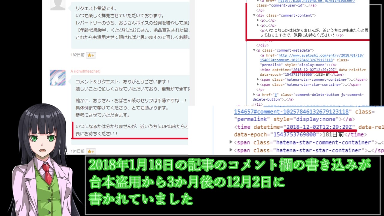 <span style="color: #00ff00; font-size: 24px;">データでは生存ほぼ間違いないのに、きな臭さが残る・・・</span><br><a href="http://www.ayatoshi.com/entry/2019/06/04/162331" target="_blank" rel="noopener nofollow">http://www.ayatoshi.com/entry/2019/06/04/162331</a><br><br>急いで作ったので無調声なのはご了承<br><span style="color: #000000; font-size: 13px;">取り急ぎのブログは恐らく指示が入ったと思いますが、最新のブログは本人の物だと思います</span><br>この動画であかり先生の件に首を突っ込むのをお終いにします<br><br>前回→<a href="https://www.nicovideo.jp/watch/sm35198142" class="watch">sm35198142</a> <br>次回→<a href="https://www.nicovideo.jp/watch/sm35314499" class="watch">sm35314499</a> (コメント返し)<br>補習2.9回→<a href="https://www.nicovideo.jp/watch/sm35158488" class="watch">sm35158488</a><br>マイリスト→<a href="https://www.nicovideo.jp/mylist/65602600" target="_blank" rel="noopener">mylist/65602600</a>
