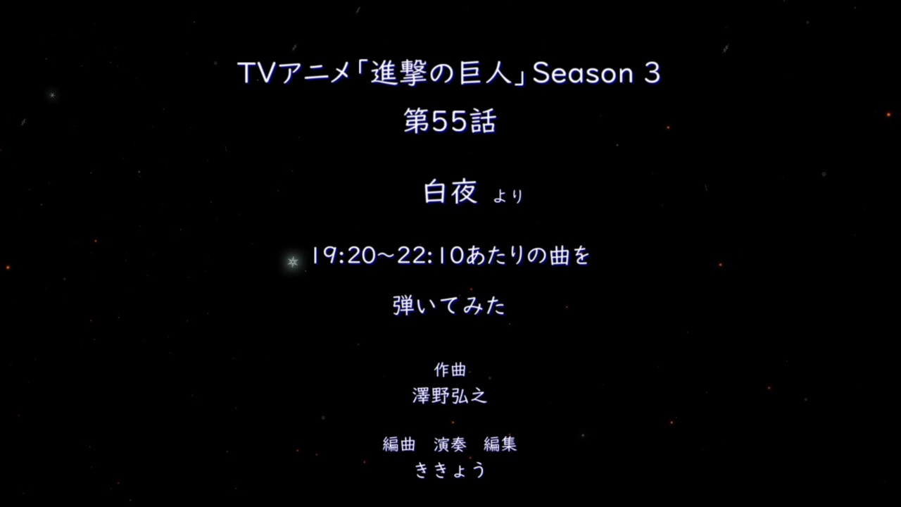 TVアニメ 進撃の巨人 Season3<br>55話 白夜 より<br>19:20~22:10あたりのBGMをpianoで弾いてみました。<br><br>56話 地下室 を迎える前に......弾いてみたかっただけです。<br>完成度は追及しませんでした。<br>個人的写経です。<br><br><br>当方のマイリスはこちら<br>(進撃の巨人・刀剣乱舞他の弾いてみた、MMD)<br><a href="https://www.nicovideo.jp/mylist/55541121" target="_blank" rel="noopener">mylist/55541121</a><br><br><span style="color: #000000; font-size: 14px;">ーーーーーーーーーーーーーーーーーーー</span><br><span style="color: #252525; font-size: 14px;">isaj </span><span style="color: #252525;">さんっっっ!!!</span><span style="color: #252525; font-size: 14px;">k12 </span><span style="color: #252525;">さんっっっ!!!</span><br><span style="color: #000000; font-size: 14px;">広告、ありがとうございます!!!!!<br>ーーーーーーーーーーーーーーーーーーー<br><br>追記</span><br>曲名 SymphonicSuite[AoT]Part2-6th:ThanksAT<br> T-KT<br>こちらのアレンジ<br><br><br>無断転載禁止<br>Do not use my work without my permission<br>請勿無權轉載<br>무단전재 및 재배포 금지