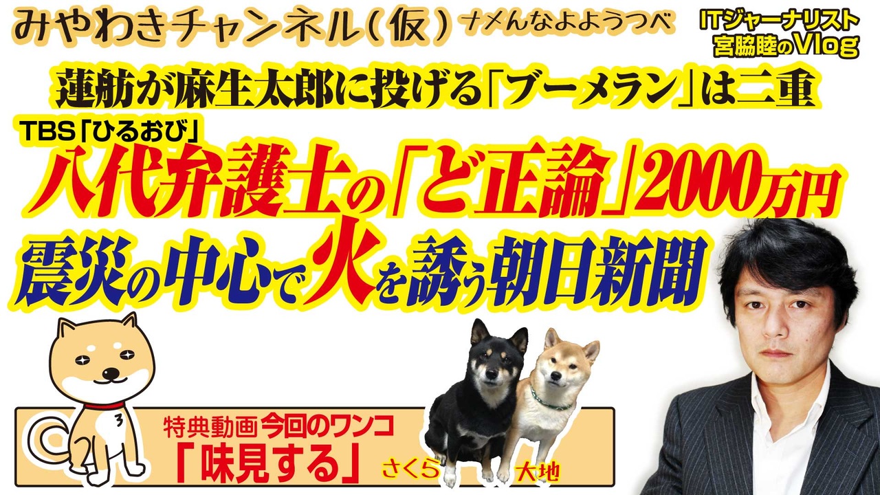 TBS「ひるおび」八代弁護士の年金をめぐる「正論」。<br>震災の中心で火を誘う朝日新聞。<br>蓮舫参議院が麻生太郎に投げる「ブーメラン」は二重。<br><br>1:30 震災直後に「火」を誘う朝日新聞とは<br>4:11 見出し詐欺を始めた朝日と「変態」毎日<br>6:27 麻生へのブーメランが刺さる蓮舫議員<br>8:20 答えはあってるのに式を間違う玉川社員<br>10:44 八代弁護士の「日本人と年金」のど正論<br>14:26 今回のワンコ「味見する」<br><br>みやわきチャンネル(仮)#487Restart345<br>(旧・マスコミでは言えないこと)<br>オリジナル2019年6月19日配信<br><br>番組の最後に「柴犬」のコーナーがあります。<br>今回のワンコ「味見する」<br><br>■わんこ総集編はこちらから!<br>何かあっても大丈夫、のはず。仮にこの「ワンコチャンネル」になにかあれば・・・オッス、○○と。<br>今回のワンコ総集編〜さくら&大地〜<br><a href="https://www.youtube.com/channel/UChwY..." target="_blank" rel="noopener nofollow">https://www.youtube.com/channel/UChwY...</a><br><br>■ニコニコ動画<br><a href="http://www.nicovideo.jp/user/13610165" target="_blank" rel="noopener nofollow">http://www.nicovideo.jp/user/13610165</a><br>■FRESH LIVE<br><a href="https://freshlive.tv/miyawaki-ch" target="_blank" rel="noopener nofollow">https://freshlive.tv/miyawaki-ch</a><br>■FC2動画<br><a href="https://video.fc2.com/account/16696711" target="_blank" rel="noopener nofollow">https://video.fc2.com/account/16696711</a><br>■YouTube(理不尽に消えることあり)<br><a href="https://www.youtube.com/c/AtsushiMiyawaki" target="_blank" rel="noopener nofollow">https://www.youtube.com/c/AtsushiMiyawaki</a><br><br>■いつ「消える」かわかりません。<br>そこでオフィシャルサイトで「非常用連絡先」をご確認ください。<br>「みやチャン(仮)」公式サイト「MiyawakiNewsNetwork」<br><a href="http://www.miyawakiatsushi.net" target="_blank" rel="noopener nofollow">http://www.miyawakiatsushi.net</a><br><br>■理不尽に消えたとき、以下で情報配信しております。ぜひ、ご登録ください。<br><br>■ツイッター<br><a href="https://twitter.com/miyawakiatsushi" target="_blank" rel="noopener nofollow">https://twitter.com/miyawakiatsushi</a><br>■Facebook<br><a href="https://www.facebook.com/miyawakiatsushi" target="_blank" rel="noopener nofollow">https://www.facebook.com/miyawakiatsushi</a>