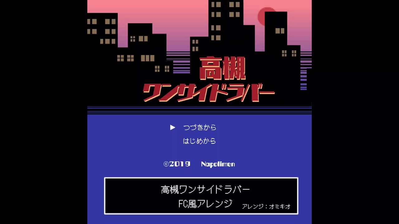 <br>ナポリの男たち の蘭たんの曲<br>『高槻ワンサイドラバー』を耳コピしてFC風にアレンジさせてもらいました。<br>ゲームのタイトル風の画面も作りました。<br><br><br>【原曲情報】<br>『高槻ワンサイドラバー』<br>歌:蘭たん<br>歌詞:蘭たん<br>Mix:ざく<br>(<a href="https://www.nicovideo.jp/watch/so34464896" class="watch">so34464896</a> ※会員限定)<br>曲:騒音のない世界様「それゆけワンダーランド」<br>( Youtube→ <a href="https://youtu.be/ljKLdsoCa8o" target="_blank" rel="noopener nofollow">https://youtu.be/ljKLdsoCa8o</a> )<br>( ニコニコ→ <a href="https://www.nicovideo.jp/watch/sm36177893" class="watch">sm36177893</a>)<br><br>■よかったら他のナポ男アレンジも聞いてください<br>…… <a href="https://www.nicovideo.jp/mylist/65842278" target="_blank" rel="noopener">mylist/65842278</a><br><br>■オリジナル曲も良ければ…!<br>……<a href="https://www.nicovideo.jp/mylist/67354294" target="_blank" rel="noopener">mylist/67354294</a><br> <br><br>とりあえずナポリの作りたくなった曲はひととおり作ったので、また他の動画でコメントもらった曲等、自分のペースで耳コピして動画作って上げられたらなと思います。ご視聴ありがとうございます!<br><br>追記:<br>投コメの誤字なおしました。<br>歌詞ミスも投稿者コメントとして訂正しておきました。<br>重大なミスをしてしまいすみません…。<br>ご指摘くださった方ありがとうございました!<br><br>追記の追記:<br>名無しさん、しゃーぷーるさん、memoさん、ナナシさん、お好み焼きウッちゃんさん、庭鳥湖さん、広告ありがとうございます!凄く凄く嬉しいです!!土下座!<br><br>《作者Twitter》<a href="https://twitter.com/moninoni" target="_blank" rel="noopener nofollow">https://twitter.com/moninoni</a>