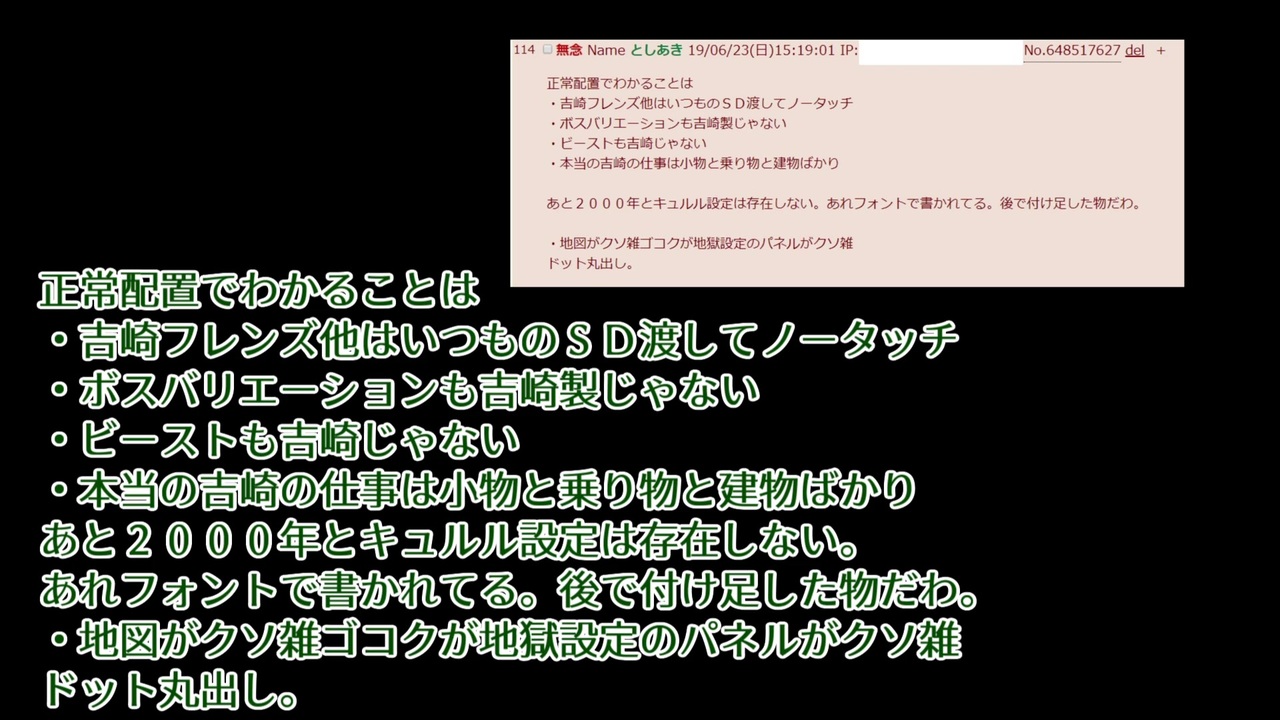 隠蔽体質によって、ウワサは強度を増す。<br>なまじ撮影禁止エリアにしてしまったことで、<br>「吉崎を囮にするためのヘイト誘導」の可能性が生まれる。<br><br>3.26寝言「細谷(伸之P)は(吉崎観音)総監督に全部の罪おっかぶせ成功した模様」<br><a href="https://www.nicovideo.jp/watch/sm35298864" class="watch">sm35298864</a><br><br>吉崎観音氏がテ□東から脅迫されてた質問に対する解釈、株主氏への感謝<br><a href="https://www.nicovideo.jp/watch/sm35298465" class="watch">sm35298465</a><br><br><br>としあきメモ<br>・□キャラ総監督指定3面図のうちゴマちゃんだけ後ろ姿のカットだけで「○ードランナーはなんとこれだけ!」の総監督コメント<br>・ゴマちゃんの頭の辺りに「★がちょういけてます」の総監督コメ<br>・カンザシフウチョウの触角1本に赤で×××が書かれていて「【重要】触角は2本にします すみませんがよろしくお願いします」とのコメ<br>・カルガモは3面図で頭飾りの色分けが詳細指定されてたのでカルガモとマガモの区別が付いていないマヌケは誰だったのか判明<br><br>会場にはおまいら…としあきぽいのが15人近く居たけどうち何人かは総監督クソ設定を熱心にメモってた<br>どのジョージの目も笑ってなかったのだ…<br><br>続としあきメモ<br>わーるど設定は俺が思ってる以上に脳と体を破壊していたようだ<br><br>キュルル2000年設定が吉崎謹製なのかはどうでもいいが<br>2000年前の物語とか称してサーバル(第一世代)が大型セルリアンと戦って死ぬまでの鉛筆漫画を掲示してる時点で確定だろこんなもん<br><strong>「野生解放深度第二!」</strong>と叫びながら目を光らせるサーバルとか出てきて新劇見ながらコンテ切ってんじゃねーよそういうのは手前の同人誌でやれこのバカと声が出かけたぞ<br><br>撮影禁止のことに貼られたのが本当に残念だが内容を要約すると<br>・キュルルぽい少年(おそらくコピー前のオリジナル)を吸収しようとする超大型セルリアン<br>・サーバルとカラカルがオリキュルを助けようとするが攻撃が全く効かない<br>・「野生解放深度第二!」<br>・やったと大喜びするミライさんの横で「バイバイサーバル」と呟くカラカル<br>・大型セルリアンが斃されてサンドスターが放出された後地面に倒れているオリキュル その傍らに横たわるサーバル(猫)<br>・数年後サンドスターを受けて光の玉になるサーバル 「次こそは幸せな未来を…」fin<br><br>…悪ぃ蛸壺屋愛好家の俺でも打ってて辛ぇわコレ