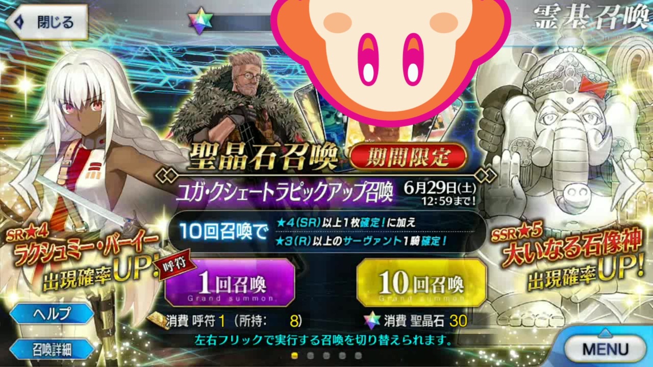 こんにちは、こんばんは、初めましての方は初めまして。<br><br>2部4章『創世滅亡輪廻 ユガ・クシェートラ 黒き最後の神』のガチャ動画です。<br><br>紙芝居系です。出てくるサーヴァント、その他キャラは私が所持しているキャラのみです。<br><br><span style="font-size: 16px;"><strong>再臨絵やストーリーのネタバレがあります。ご注意ください。</strong></span><br><br>タピオカチャレンジはいいとして、数時間も並んでタピオカティーを飲む理由がわからない。<br>田舎暮らしの者にはわからないのだろうか?コンビニのでよくねってなる。<br>てか、タピオカって言ってもこんにゃくみたいなもんじゃねぇの?<br>あ、違う。あそう。<br>え?ポン・デ・リングのモチモチはタピオカのおかげ?<br>他にも冷凍うどんなどの品質維持に使われている?<br>流行と偏見でタピオカを侮辱するな?<br>・・・すみません・・<br><br>てな感じで従妹のJKに説教されました。<br>その子は調理師を目指してる。頑張れ。<br>そして本当にすみませんでした・・・<br><br><br>え?動画時間が短い?つまりはそういう事だよ。<br><br>最近呟くようになったtwitter。<br>アカウント【 @kiti45020435 】<br><br>FGOマイリスト:<a href="https://www.nicovideo.jp/mylist/62541923" target="_blank" rel="noopener">mylist/62541923</a><br>前回 <span style="color: #001835;">【FGOガチャ動画】事件簿コラボイベ『レディライネスの事件簿』継ぎ接ぎの偽りの記憶(False memory)</span>:<a href="https://www.nicovideo.jp/watch/sm35106566" class="watch">sm35106566</a><br><br>何はともあれ生暖かい目で見て下さい。お願いします。<br>ネタ動画ですが、転載はご遠慮ください 。<br>