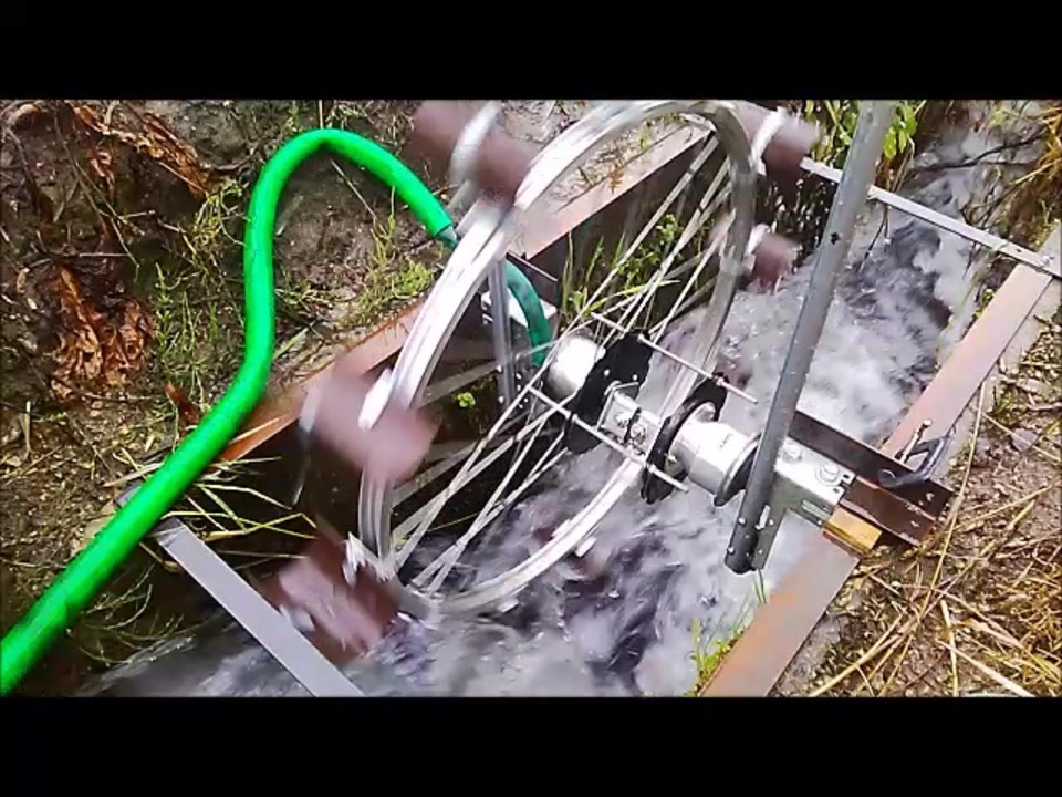 発電量をもう少し増やそうと、もう一つハブダイナモを直結してみました。二つのダイナモ出力を全波倍電圧整流回路に入力して直流出力としています。電力測定してみるとおよそ1.3Wでした。ハブダイナモは二つとも古い廃棄品で劣化(内部抵抗が増加?)が進んでいたのかも知れません。それでもと思いプラズマボールにつないでみると何とか点灯できました。今回痛感したのは水車による発電には増速機構が必要ということです。