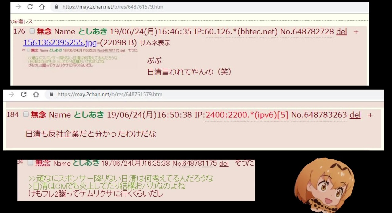 176 無念 Name としあき 19/06/24(月)16:46:35 IP:60.126.*(bbtec.net) No.648782728 del <br>ぷぷ<br>日清言われてやんの(笑)<br><br>84 無念 Name としあき 19/06/24(月)16:50:38 IP:2400:2200.*(ipv6)[5] No.648783263 del +<br>日清も反社企業だと分かったわけだな<br><br><a href="https://may.2chan.net/b/res/648761579.htm" target="_blank" rel="noopener nofollow">https://may.2chan.net/b/res/648761579.htm</a><br><br>魚拓<br><a href="https://web.archive.org/web/20190624080617/https://may.2chan.net/b/res/648761579.htm" target="_blank" rel="noopener nofollow">https://web.archive.org/web/20190624080617/https://may.2chan.net/b/res/648761579.htm</a><br><br>>IP:60.126.*(bbtec.net)<br>>IP:2400:2200.*(ipv6)<br><br><br>【株主向け】6.25テレ東株主総会に向けて<br><a href="https://www.nicovideo.jp/watch/sm35300840" class="watch">sm35300840</a><br><br>けものフレンズちゃんねる<br><a href="http://kemono-friendsch.com/" target="_blank" rel="noopener nofollow">http://kemono-friendsch.com/</a><br><br>けものフレンズ2騒動まとめ<br><a href="https://kemono2.memo.wiki/" target="_blank" rel="noopener nofollow">https://kemono2.memo.wiki/</a>