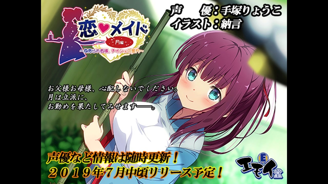 <span style="color: #000000; font-size: 14px;">エモイ堂の第10弾『</span>恋メイド -月編- ~身売られ若様、ナイショの蜜月~(バイノーラル録音)<span style="color: #000000; font-size: 14px;">』が7/1にリリースです! <br><br>本編約3時間20分+DM特典40分の合計約4時間のたっぷりでお送りする和風ASMR、耳かきや耳舐め、さらにもっと気持ちいいご奉仕も♪な癒し音声作品です。</span><br><br><a href="https://www.dlsite.com/maniax/announce/=/product_id/RJ249542.html" target="_blank" rel="noopener nofollow">https://www.dlsite.com/maniax/announce/=/product_id/RJ249542.html</a><br><br><span style="color: #000000; font-size: 14px;">本動画は2Cp分(合計40分程度)をお楽しみいただけます!</span><br><br><span style="color: #333333; font-size: 13px;">01.当主様に生涯お仕えいたします(14:37) 導入<br>02.女性と触れ合うことに慣れましょう(26:03) マッサージ<br><br>■恋メイド-月編- キャスト紹介■<br>~声優~<br>手塚りょうこ 様<br>Twitter:</span><span style="color: #663399; font-size: 13px;"><a href="https://twitter.com/1015ryouko" target="_blank" rel="noopener nofollow">https://twitter.com/1015ryouko</a></span><br><br><span style="color: #333333; font-size: 13px;">~声優~<br>杏仁らいち(DM特典のみ)<br>Twitter:</span><span style="color: #663399; font-size: 13px;"><a href="https://twitter.com/anninninraichi" target="_blank" rel="noopener nofollow">https://twitter.com/anninninraichi</a></span><br><br><span style="color: #333333; font-size: 13px;">~イラスト~<br>納言(エモイ堂)<br>Twitter:</span><span style="color: #663399; font-size: 13px;"><a href="https://twitter.com/emoi_do" target="_blank" rel="noopener nofollow">https://twitter.com/emoi_do</a></span><br><span style="color: #333333; font-size: 13px;">pixiv:</span><span style="color: #663399; font-size: 13px;"><a href="https://www.pixiv.net/member.php?id=31731664" target="_blank" rel="noopener nofollow">https://www.pixiv.net/member.php?id=31731664</a></span>