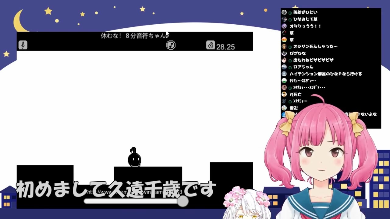 <span style="font-size: 18px;"><strong>※音量注意※</strong></span><br><br>進む方法はお尻と鍋ラップと変わったァーー!<br>配信中はもっともっともっとたくさんやってます。<br>深夜なのに爆笑した。<br><br>※2019/6/30追記<br>綴りミス指摘感謝恥ずかしすぎて見返したくなくなるけど遠北のアーカイブは見て<br><br>■元動画<br>【休むな!八分音符ちゃん】声真似でStage1クリアするまで眠れません!<br><a href="https://www.youtube.com/watch?v=zINhqDFOJ2U" target="_blank" rel="noopener nofollow">https://www.youtube.com/watch?v=zINhqDFOJ2U</a><br><br>■遠北千南<br>Youtube:<a href="https://www.youtube.com/channel/UCuz0vzQgC8LRdS6lVV0UkUg" target="_blank" rel="noopener nofollow">https://www.youtube.com/channel/UCuz0vzQgC8LRdS6lVV0UkUg</a><br>Twitter:<a href="https://twitter.com/ac1kt" target="_blank" rel="noopener nofollow">https://twitter.com/ac1kt</a><br>