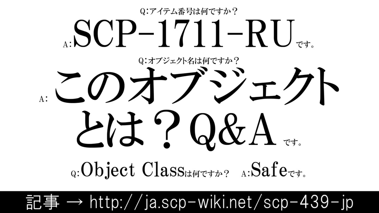 <span style="font-size: 16px;">Q:フレーバーテキストは何ですか?<br>A:『</span><span style="font-size: 18px;"><strong>一問一答。</strong></span><span style="font-size: 16px;">』です。<br>Q:出典は何ですか?<br>A:『SCPフレーバーテキスト集 SCP国際版』です。</span><br><br><br>Q:初投稿ですか?<br>A:初投稿です。<br><br>Q:これはどんな動画ですか?<br>A:一時期流行った「15秒でわかる日本昔話」風に、SCP-1711-RUを紹介する動画です。<br>Q:なぜこの動画を作ろうと思ったんですか?<br>A:SCPが好きで、動画を作ってみたかったからです。<br>Q:何作目ですか?<br>A:14作目です。<br><br>Q:記事ははどれですか?<br>A: <a href="http://ja.scp-wiki.net/scp-1711-ru" target="_blank" rel="noopener nofollow">http://ja.scp-wiki.net/scp-1711-ru</a> です。<br>Q:著者は誰ですか?<br>A:AkkiKama氏です。<br><br>Q:Youtubeの方のリンクはどれですか?<br>A: <a href="https://youtu.be/M2tShNZbc9I" target="_blank" rel="noopener nofollow">https://youtu.be/M2tShNZbc9I</a> です。<br><br>Q:前作は何の動画ですか?<br>A:ホームラン量産法です→ <a href="https://www.nicovideo.jp/watch/sm35196490" class="watch">sm35196490</a><br>Q:次作は何の動画ですか?<br>A:オーディションです→ <a href="https://www.nicovideo.jp/watch/sm35577157" class="watch">sm35577157</a><br><br>Q:本シリーズのマイリストはどちらですか?<br>A: <a href="https://www.nicovideo.jp/mylist/62045587" target="_blank" rel="noopener">mylist/62045587</a> です。シリーズなら です。<br>Q:ファンメイド作品はどちらですか?<br>A: <a href="https://www.nicovideo.jp/mylist/62433604" target="_blank" rel="noopener">mylist/62433604</a> です。<br>Q:投稿主のTwitterアカウントはどれですか?<br>A:@arukano128です。<br><br>Q:最後に何か一言ありますか?<br>A:この動画はCC BY-SA 3.0に基づき公開されます。