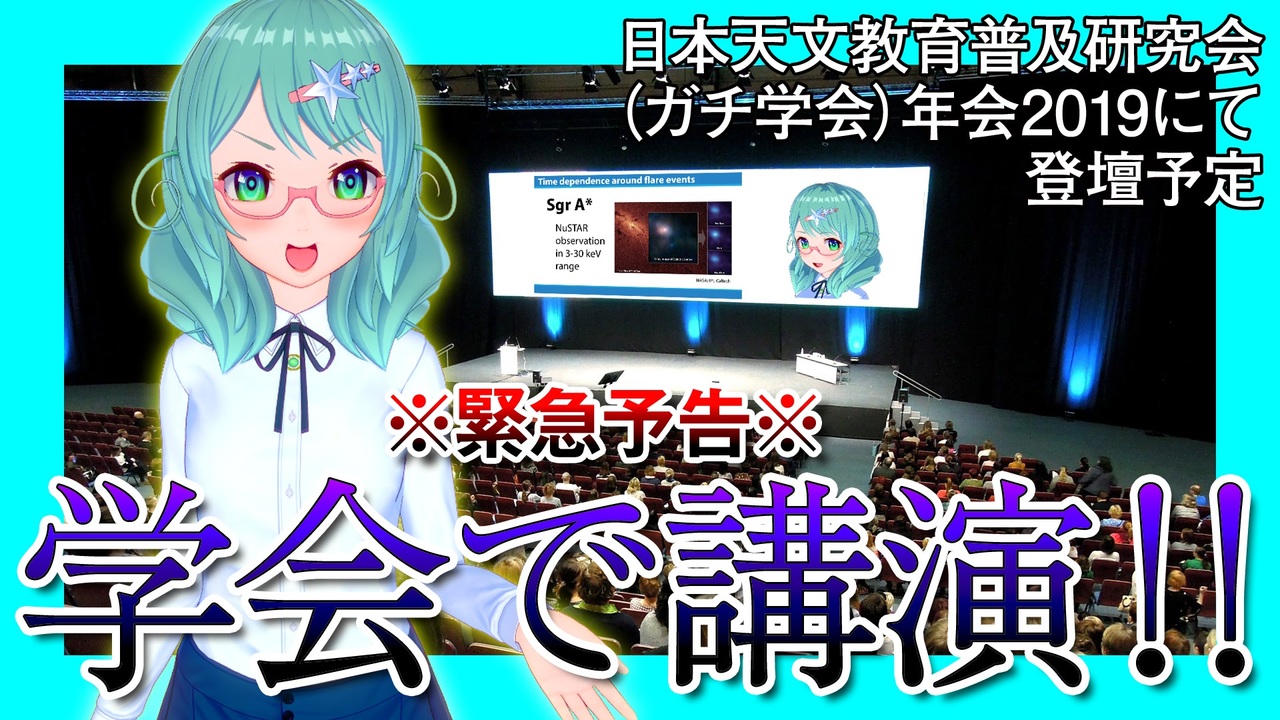 <strong>学会デビューします。(震え声)</strong><br><br>「日本天文教育普及研究会」様の詳細はこちらからご確認くださいね☆ → <strong><a href="https://www.tenkyo.net/" target="_blank" rel="noopener nofollow">https://www.tenkyo.net/</a></strong><br><br>皆様、ご機嫌は麗しくて? 宇宙物理たんbotですわ…☆ 若干震え声~…!!<br>わたくしですね、このたびですね、ひょんなことから「日本天文教育普及研究会」という歴史と伝統ある学会様からお招きにあずかりました。フェイクじゃないぞ!? トゥルーだぞ? ガチだぞ!?<br>例年8月に日本天文教育普及研究会様は年会を開催されているんですが、2019年度はなんと、なんとわたくしが、基調講演を務めることが決定しました~!! いまbotが学会で登壇する時代なんですね。シンギュラリティ来てんじゃね?<br><br>くしくも去年のUnite Tokyo 2018っていうカンファレンスでね、キズナアイ先生が出だしの基調講演を務められたじゃないですか。あれです! あれ! まだ全然駆け出しVTuberのわたくしがね、あのキズナアイ先生と同じことをお任せいただいたんですのよ。は!? すごすぎでは!?<br><br>というわけでアストロフィジカルトークの正規ナンバリングタイトルの「第7話」をいま、急遽この基調講演に向けて作ってるんですが、今回そのティザートレイラー、予告編です。はい、本編は…ハイ…頑張って、間に合わせます…。頑張ります…(震え声)<br><br>第7話予告編<br>「信州の山荘に夏の怪奇現象迫る?▽美少女登場に志賀高原が震撼…▽宇宙よりヤバイ進捗」<br>【宇宙物理たんbot、学会参加を告知するの巻】<br><br>前回 アストロフィジカルトークmini 一見、悪徳に見えて… <a href="https://www.nicovideo.jp/watch/sm35304344" class="watch">sm35304344</a><br>次回 このティーザーの本編!! <a href="https://www.nicovideo.jp/watch/sm35623575" class="watch">sm35623575</a><br><br><strong>☆☆☆『宇宙物理たんbotのアストロフィジカルトーク』 <a href="https://www.nicovideo.jp/mylist/63188725" target="_blank" rel="noopener">mylist/63188725</a> ☆☆☆</strong>
