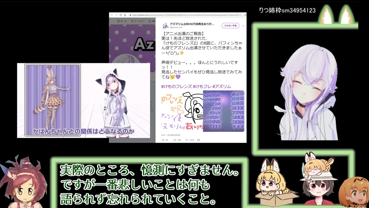 <span style="font-size: 24px;"><strong>忘れないで…忘れないで…。</strong></span><br><br><br>【簡易まとめ】アズマリムちゃんツイート反応まとめ<br><a href="https://togetter.com/li/1286049" target="_blank" rel="noopener nofollow">https://togetter.com/li/1286049</a><br><br>けものフレンズ2のテレビ東京細谷伸之Pが結月春菜(電脳少女シロの中の人)に粘着リプを繰り返していた<br><a href="https://togetter.com/li/1341679" target="_blank" rel="noopener nofollow">https://togetter.com/li/1341679</a><br><br>11月8日のツイート内容について<br><a href="https://www.youtube.com/watch?v=-MMMDy5Pxqg" target="_blank" rel="noopener nofollow">https://www.youtube.com/watch?v=-MMMDy5Pxqg</a><br><br>【けもフレ2】愛を語り過ぎでアズリムまさかの事態に…!【サーバルちゃん】<br><a href="https://www.youtube.com/watch?v=quqF6JFnW_U" target="_blank" rel="noopener nofollow">https://www.youtube.com/watch?v=quqF6JFnW_U</a><br><br><br>アズマリム @azuma_lim<br>センパイ。急にびっくりさせちゃうと思うんですけどごめんなさい。<br>アズリムは今、ママと一生懸命、センパイたちに喜んでもらえることをしたいって考えたり、一緒に楽しいことをしたいって気持ちでがんばってきました。<br>でも最近、こんさる?とか会社?の人がきて、どこかの学園に入れようとしたり、<br> 2018-11-08 01:47:09<br><br> アズマリム @azuma_lim<br>転生して性格を変えたことにしようとされていたり、アズリムが望まないことを無理矢理押し付けられることになりました。アズリムもよく分からなくて混乱してるけど、「あなたの気持ちなんてどうでもいい」と言われたり、センパイたちのことを数字やお金としかみていなくて、何も同意できることがなくて<br> 2018-11-08 01:47:41<br><br> アズマリム @azuma_lim<br>すごく苦しいです。この先、アズリムがアズリムらしくいるにはどうしたらいいのかな。本当はこういうこと言いたくなくてずっと悩んでたんだ。けどごめんねセンパイ。。センパイ、助けて。。<br> 2018-11-08 01:47:45