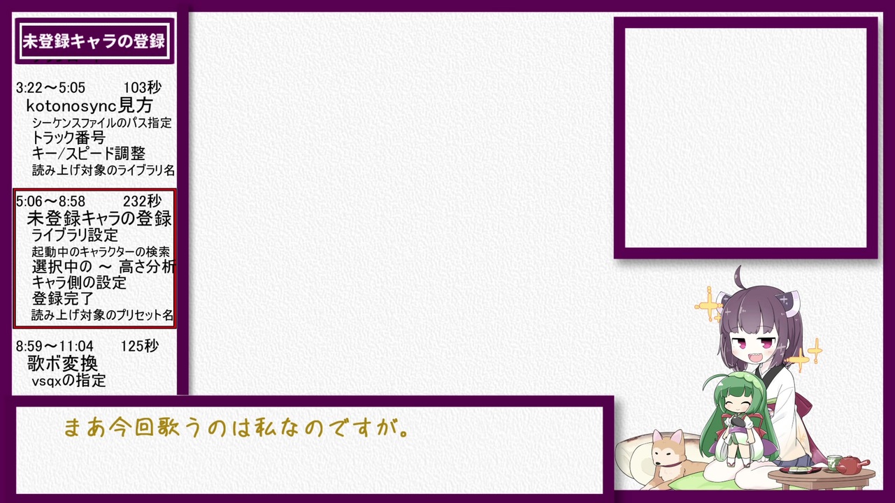 初心者なりに出来る限り分かりやすく「歌うボイスロイドを作る方法」を解説した動画です。<br>何分浅知恵での解説となりますので、もし間違いがあればコメント等で訂正して頂けると有り難いです。<br>本当はまとめて投稿する予定だったのですが、思っていたより時間がかかりそうなので出来た分から上げていくことにしました。<br>製作速度が遅くて申し訳ありません。<br><br><br>・このPartではkotonosyncの導入と見方、初期設定と歌ボへの変換などを解説します。<br>最低限の説明しか出来てないと思いますので、是非スズモフ様のブロマガや動画も御覧ください。<br><br><br><br>◆スズモフ様のkotonosync : <a href="https://www.nicovideo.jp/watch/sm29541659" class="watch">sm29541659</a><br><span style="color: #ff0000;">◆ブロマガ終了に伴い、kotonosyncの配布場所が変更されました。<br><a href="https://suzumof.com/data/software/sync.php" target="_blank" rel="noopener nofollow">https://suzumof.com/data/software/sync.php</a></span><br>◆歌うボイスロイド用の音階数値表(2019年7月版)<br><a href="https://ch.nicovideo.jp/suzumf/blomaga/ar1779857" target="_blank" rel="noopener nofollow">https://ch.nicovideo.jp/suzumf/blomaga/ar1779857</a><br><br><br><br>Part.Z(前語り) → <a href="https://www.nicovideo.jp/watch/sm35178318" class="watch">sm35178318</a><br>Part.A(UTAUの導入と配布確認) → <a href="https://www.nicovideo.jp/watch/sm35178359" class="watch">sm35178359</a><br>Part.B前(UTAUの操作説明) → <a href="https://www.nicovideo.jp/watch/sm35210688" class="watch">sm35210688</a><br>Part.B後(wavetoneの導入と説明他) → <a href="https://www.nicovideo.jp/watch/sm35246425" class="watch">sm35246425</a><br>Part.C(convmakiの導入と変換色々) → <a href="https://www.nicovideo.jp/watch/sm35303058" class="watch">sm35303058</a><br>Part.D(kotonosyncの導入と歌ボ出力) → ここ<br>Part.E(<span style="color: #000000; font-size: 13px;">新Ver.kotonosyncによる音程自動調整</span>) → <a href="https://www.nicovideo.jp/watch/sm35399917" class="watch">sm35399917</a><br><span style="color: #000000; font-size: 14px;">Part.F(歌ボ製作の一連の流れ) → </span><a href="https://www.nicovideo.jp/watch/sm35432351" class="watch">sm35432351</a><br>Part.EX群 → <a href="https://www.nicovideo.jp/watch/sm35747179" class="watch">sm35747179</a><br><br>この講座のマイリスト【<a href="https://www.nicovideo.jp/mylist/65660926" target="_blank" rel="noopener">mylist/65660926</a>】