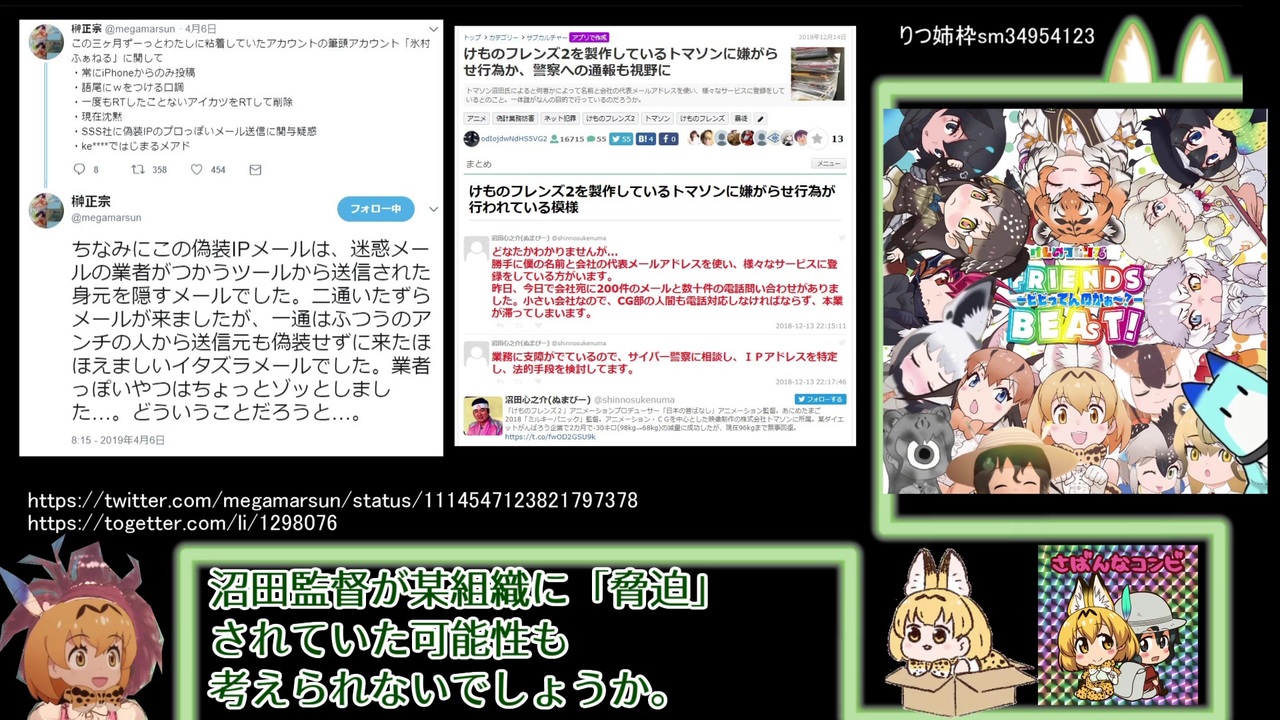 <span style="font-size: 24px;"><strong>※本動画はトマソン・沼田監督に擁護的な動画です。</strong></span><br><br>榊正宗<br>@megamarsun<br>ちなみにこの偽装IPメールは、迷惑メールの業者がつかうツールから送信された身元を隠すメールでした。二通いたずらメールが来ましたが、一通はふつうのアンチの人から送信元も偽装せずに来たほほえましいイタズラメールでした。業者っぽいやつはちょっとゾッとしました…。どういうことだろうと…。<br><a href="https://twitter.com/megamarsun/status/1114547123821797378" target="_blank" rel="noopener nofollow">https://twitter.com/megamarsun/status/1114547123821797378</a><br><br>沼田心之介(ぬまぴー) @shinnosukenuma<br>どなたかわかりませんが…<br>勝手に僕の名前と会社の代表メールアドレスを使い、様々なサービスに登録をしている方がいます。<br>昨日、今日で会社宛に200件のメールと数十件の電話問い合わせがありました。小さい会社なので、CG部の人間も電話対応しなければならず、本業が滞ってしまいます。<br> 2018-12-13 22:15:11<br> 沼田心之介(ぬまぴー) @shinnosukenuma<br>業務に支障がでているので、サイバー警察に相談し、IPアドレスを特定し、法的手段を検討してます。<br> 2018-12-13 22:17:46<br><br>けものフレンズ2を製作しているトマソンに嫌がらせ行為か、警察への通報も視野に<br><a href="https://togetter.com/li/1298076" target="_blank" rel="noopener nofollow">https://togetter.com/li/1298076</a><br><br><a href="https://archive.fo/fweB8" target="_blank" rel="noopener nofollow">https://archive.fo/fweB8</a>