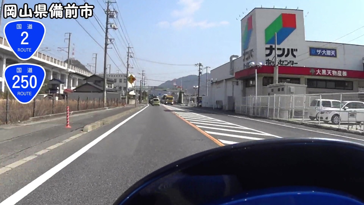 <strong>この路線は、どうしても収録したかったです。理由は、様々な車載動画と繋げるためです。</strong><br>PCXに乗って、国道250号を終点(岡山県岡山市北区)から、起点(兵庫県神戸市長田区)まで走ってみました。<br>今回は、終点から、国道2号と国道374号との交点である、伊部東交差点までとなります。<br><br>2018年3月収録<br>走行区間:岡山県岡山市北区~岡山県備前市<br>次:<a href="https://www.nicovideo.jp/watch/sm35383465" class="watch">sm35383465</a><br>乗換(R2、有年・姫路方面):<a href="https://www.nicovideo.jp/watch/sm41533186" class="watch">sm41533186</a><br>乗換(R484、吉備中央方面):<a href="https://www.nicovideo.jp/watch/sm42960230" class="watch">sm42960230</a><br>近況報告(Twitter):@diamor28jp<br>投稿した動画:<a href="https://www.nicovideo.jp/user/28155155" target="_blank" rel="noopener">user/28155155</a>,<a href="https://www.nicovideo.jp/mylist/56931554" target="_blank" rel="noopener">mylist/56931554</a>(車載動画)