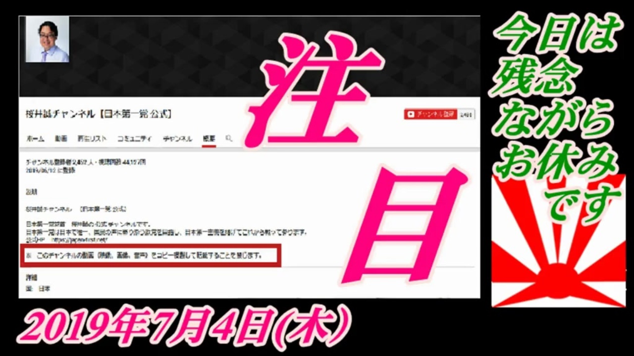 4今日は残念ながらお休みです。<br>桜井誠を応援!菜々子の独り言 2019年7月4日(木)<br><br>トップバズビデオ<br><a href="https://www.topbuzz.com/user/6482660174103315466/publish" target="_blank" rel="noopener nofollow">https://www.topbuzz.com/user/6482660174103315466/publish</a><br>デイリーモーションは(こんなニュース菜々子)で検索。<br><a href="https://www.dailymotion.com/nanakorgb" target="_blank" rel="noopener nofollow">https://www.dailymotion.com/nanakorgb</a><br>菜々子募金を始めました。 2018年9月30日(日) 0930 <br><a href="http://www.nicovideo.jp/watch/sm33940631" target="_blank" rel="noopener nofollow">http://www.nicovideo.jp/watch/sm33940631</a><br>ふわっち 桜井誠 <br><a href="https://whowatch.tv/profile/w:doronpa" target="_blank" rel="noopener nofollow">https://whowatch.tv/profile/w:doronpa</a>