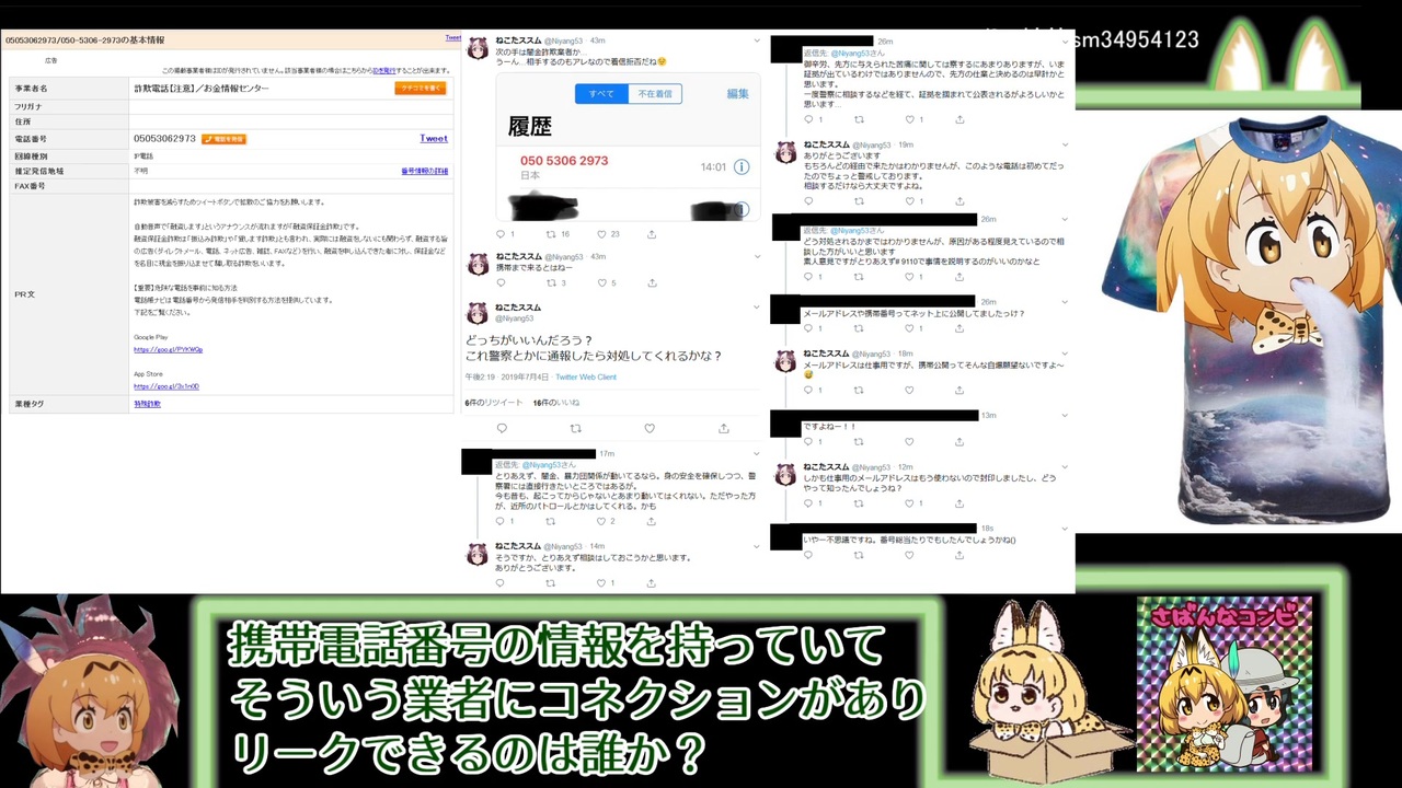 ねこた氏の携帯番号が融資保証金詐欺業者に流され電話がかかってくる<br>この件に対し以前ねこた氏批判を行っていたIPが<br>「ねこた氏が一時KADOKAWAの明細をアップしそこに載っていたカスタマバーコードを読まれて住所氏名電話番号がばれた」と主張するも<br>としあきの検証でせいぜい住所しか取得できず嘘だと判明する<br>・何故嘘をついて責任をねこた氏に擦り付けようとしたのか<br>・携帯電話番号の情報を持っていてそういう業者にコネクションがありリークできるのは誰か?<br><br><br>さっきの国税局に知り合いがいるっつったとしあきだけど返答返ってきたよ<br>質問内容は「国税局・税務署とかに「あの企業怪しいんですけど」ってチクったら動いてくれんの?」ってやつ<br>ちょっと文章長くなるから句読点使うけど嫌いなとしあきごめんね<br><br>まず大前提として税務署/国税局/国税庁についてだけど、働いている人は全員“税務職員”なんだって<br>情報は全部人々の生活に密着してる各税務署で管理されてて、複数の税務署にまたがるようなでかい企業を調査するときとかは、各税務署から依頼を出して、国税局なり庁なりが表に出てくるらしい<br><br>で、「この企業怪しくね?」っていう通称“たれ込み”は、それこそ「隣の親父が怪しいから調べろ」レベルのものまで日常的に行われてるらしい<br>個人情報とか守秘義務の関係で、たれ込まれた後どうなったか結果は答えられないよとも言われた<br>どれくらい集まったら動いてくれんの?って聞いたら「守秘義務」って返答された<br>まあたぶん、わんさかお問合せ集まったら動くんじゃないかなあっていう個人的推測<br><br>とりあえず結論としては、一般の側のアプローチは「お近くの税務署へ」だってさ<br><br><br>追記<br><span style="color: #000000; font-size: 14px;">エンタテインメントノベル局 第三編集部 MFブックス編集部</span><br><span style="color: #006699; font-size: 14px;"><a href="https://8card.net/p/39610531150" target="_blank" rel="noopener nofollow">https://8card.net/p/39610531150</a><br><br><a href="https://web.archive.org/web/20190705050122/https://8card.net/p/39610531150" target="_blank" rel="noopener nofollow">https://web.archive.org/web/20190705050122/https://8card.net/p/39610531150</a><br><a href="http://archive.is/m7jKY" target="_blank" rel="noopener nofollow">http://archive.is/m7jKY</a></span>