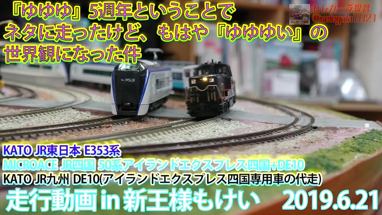 皆さんこんにちは。セレガーラ交通局のセレガーラ提督です。<br>本日の動画はアニメ『結城友奈は勇者である』が5周年を使えたということで同作品の舞台で話題となった四国(正確には香川県観音寺市)を走る車両に加え、ゲーム『結城友奈は勇者である 花結いのきらめき』も2周年を迎えたということで両作品の舞台になった地域を走る車両をピックアップしていつもお世話になっている新王様もけいさんにて走行動画を撮影しました。<br>そもそも『ゆゆゆ』や『ゆゆゆい』の世界でコイツらが走っているかがまず怪しいですがw<br>『結城友奈は勇者である』『乃木若葉は勇者である』は香川県、『白鳥歌野は勇者である』が長野県諏訪地方を舞台にしていることから四国側からは50系アイランドエクスプレス四国(友情出演:1200形)、長野からはE353系を登場させていますが、専用のDE10-1136の動力不調によりJR九州のDE10が代走を務めています。<br>その他にも下記の偶然すぎる中の人ネタが入っています。<br>・103系1500番台6両編成(新王様もけい所有。土居球子と佐賀県が舞台のゾンビランドサガの源さくらの中の人が同じで、源さくらの出身地と思われる唐津を走っていた車両)<br><br>YouTube版はこちら→<a href="https://youtu.be/nkyMZqOrMeo" target="_blank" rel="noopener nofollow">https://youtu.be/nkyMZqOrMeo</a><br>過去の動画→<a href="https://www.nicovideo.jp/mylist/58106109" target="_blank" rel="noopener">mylist/58106109</a><br>コミュニティ開設しました→co3922366 / co3981909<br>Twitter→<a href="https://twitter.com/selegala1021" target="_blank" rel="noopener nofollow">https://twitter.com/selegala1021</a><br><br>前回:<a href="https://www.nicovideo.jp/watch/sm35234054" class="watch">sm35234054</a>→ 今回 → 次回:<a href="https://www.nicovideo.jp/watch/sm35535918" class="watch">sm35535918</a>
