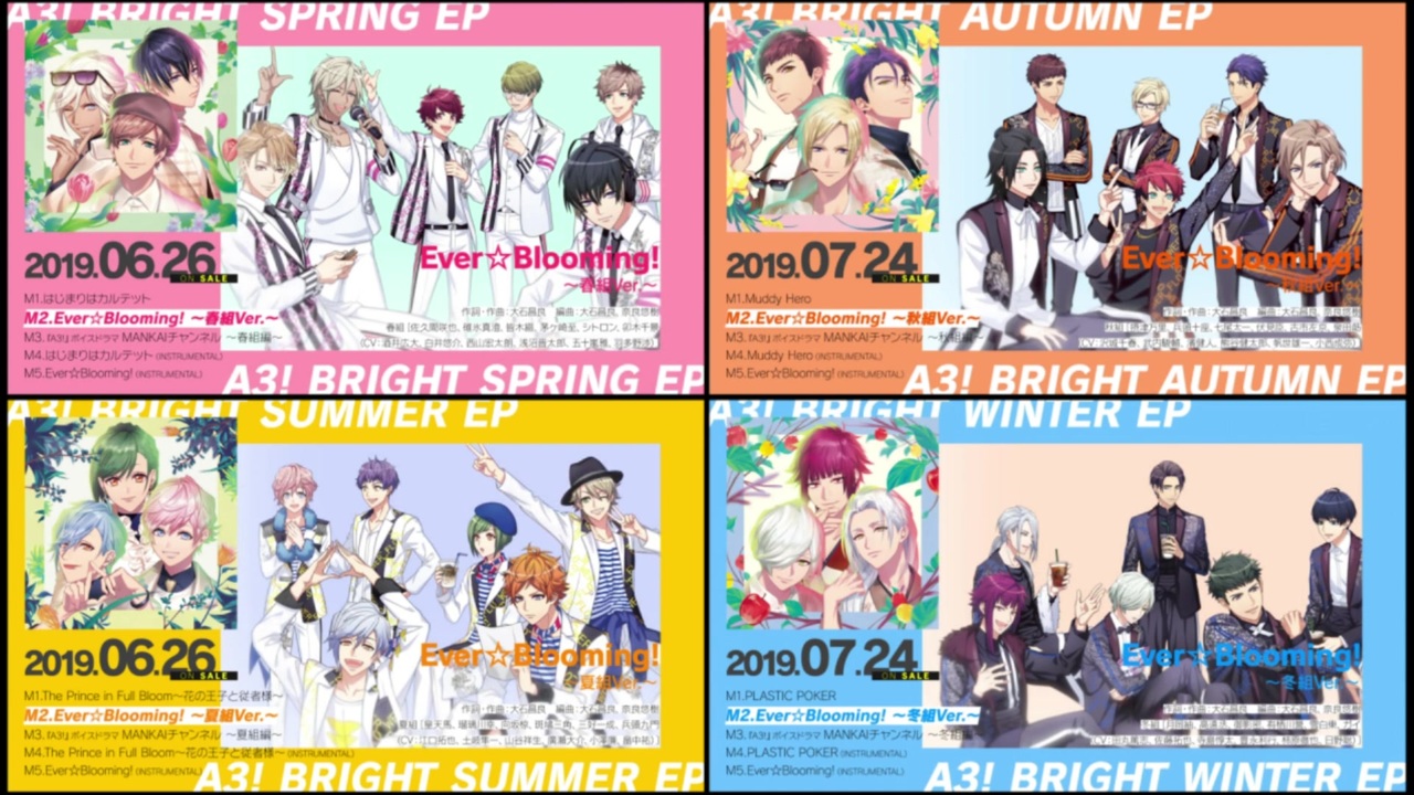 「春、夏、秋、冬」のところがやりたかっただけです。<br><br>同時再生部分はそのまま重ねると伴奏が×4になってボーカルが聴き取りにくいので、ボーカルを抜き出した物に再度伴奏を付けてあります。<br>後半は抜出が上手くいかなかったので、1曲通しての同時再生や抽出版の動画は作れません。<br>シャカシャカノイズや映像との音ズレ等気にならない方のみご覧ください。<br><br>「 Ever☆Blooming!」 <br>作詞・作曲:大石昌良 編曲:大石昌良、奈良悠樹<br><br>~春組Ver.~<br>佐久間咲也、碓氷真澄、皆木綴、茅ヶ崎至、シトロン、卯木千景<br>(CV:酒井広大、白井悠介、西山宏太朗、浅沼晋太郎、五十嵐雅、羽多野渉)<br><br> ~夏組Ver.~<br>皇天馬、瑠璃川幸、向坂椋、斑鳩三角、三好 一成、兵頭九門<br>(CV:江口拓也、土岐隼一、山谷祥生、廣瀬大介、小澤 廉、畠中祐)<br><br>~秋組Ver.~<br>摂津万里、兵頭十座、七尾太一、伏見臣、古市左京、泉田莇<br>(CV:沢城千春、武内駿輔、濱健人、熊谷健太郎、帆世雄一、小西成弥)<br><br>~冬組Ver.~<br>月岡紬、高遠丞、御影密、有栖川誉、雪白東、ガイ<br>(CV:田丸篤志、佐藤拓也、寺島惇太、豊永利行、柿原徹也、日野聡)<br><br>『 A3!ミニアルバム第四弾』収録<br>最新情報は公式サイト&Twitterで更新中!<br><br>【公式サイト】<br><a href="http://www.a3-liber.jp" target="_blank" rel="noopener nofollow">http://www.a3-liber.jp</a> <br>【公式Twitter】<br><a href="https://twitter.com/mankai_company" target="_blank" rel="noopener nofollow">https://twitter.com/mankai_company</a><br><br>