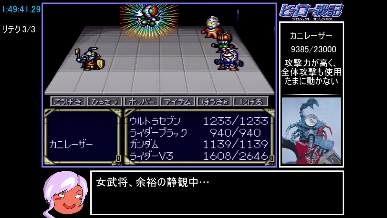 ロズウェル市クリア~ジーファ市密林入口まで<br><br>ライダー無双回。<br>体調不良&新チャートの本走中にトラブルが発生した為、大分投稿が遅れました…。<br>丈夫なガ/チ勢に改造してくれる悪の秘密結社があったら紹介して欲しいゾ。<br><br>前:<a href="https://www.nicovideo.jp/watch/sm35265817" class="watch">sm35265817</a> 次:<a href="https://www.nicovideo.jp/watch/sm35425812" class="watch">sm35425812</a><br><br>マイリスト&今回のレギュレーション:<a href="https://www.nicovideo.jp/mylist/65721453" target="_blank" rel="noopener">mylist/65721453</a><br><br>今回も沢山の広告ありがとナス!<br><span style="color: black;">s</span>m13869948兄貴、もみじ饅頭兄貴、ちゅう兄貴、siro兄貴、塩ガラ兄貴、どんとうおーりー兄貴、kuei兄貴、Hraesvelgr兄貴、Kumatora兄貴、C.H.R.兄貴、色白腹黒兄貴、ばっくらー兄貴、ネメシス兄貴、イノシシ兄貴、佐賀3兄貴、BOSS兄貴、ザナドゥ兄貴、シン・オジサン兄貴、銀河鉄道兄貴、White_Cat兄貴、プリプリプリケツ兄貴、内藤春人兄貴、スグル兄貴、ルチアーノ兄貴、KiRiKa兄貴、GUS兄貴、もめんこんにゃく兄貴、三途川兄貴、pongiku兄貴、れうすき兄貴、(首)兄貴、ゾロリ兄貴、basicerII兄貴、zettan兄貴、ハナモゲラ兄貴、hoyo兄貴、CAFE兄貴、アポロガイスト兄貴、せっちん兄貴、karesansui兄貴、dog兄貴、オルゴ・デミーラ兄貴、マロール兄貴、ルーリマ・ンコ兄貴、生けも兄貴、カツ丼食べる兄貴、さいたま兄貴、はつけん兄貴、リブナニッカ+兄貴、知床兄貴、悪夢の主、ミコラーシュ兄貴、野良ドッグ兄貴、あぃあぃ兄貴、Voynich M兄貴