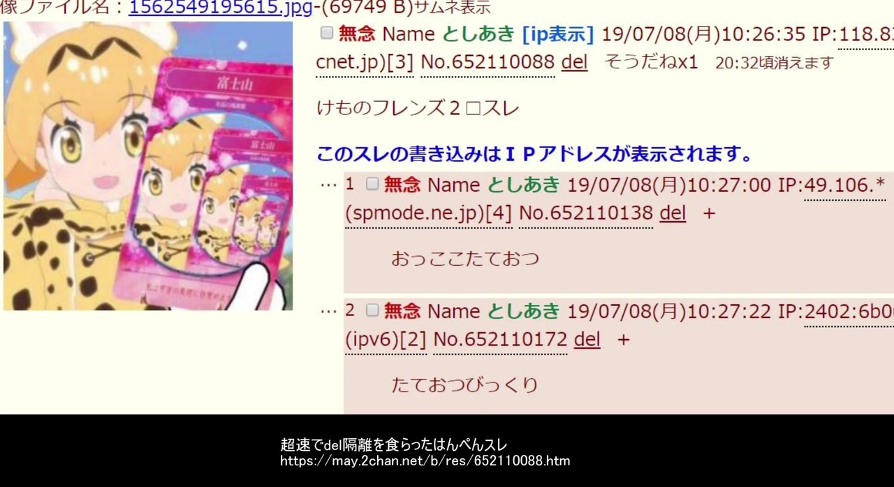 <span style="font-size: 24px;"><strong>現本スレ(隔離回避)<br><a href="https://may.2chan.net/b/res/652115185.htm" target="_blank" rel="noopener nofollow">https://may.2chan.net/b/res/652115185.htm</a></strong></span><br><br>【けものフレンズ】明日なにかあるという噂<br><a href="http://kemono-friendsch.com/archives/86326" target="_blank" rel="noopener nofollow">http://kemono-friendsch.com/archives/86326</a><br><br><br>追記<br>キュルルスレも超速隔離された模様<br><br><br><br>考察<br>スレのタイトルか画像で判断している?<br>向こうも本腰入れて対策を取ってきている模様。<br><br><br><span style="color: #800000; font-size: medium;">隔離スレがみたそうなとしあきがいるっぽいので<br>さっきまで開いてた隔離されたスレ</span><br><span style="font-size: medium;"><a href="https://may.2chan.net/b/res/652110088.htm" target="_blank" rel="noopener nofollow">https://may.2chan.net/b/res/652110088.htm</a><br><a href="https://may.2chan.net/b/res/652109844.htm" target="_blank" rel="noopener nofollow">https://may.2chan.net/b/res/652109844.htm</a></span>