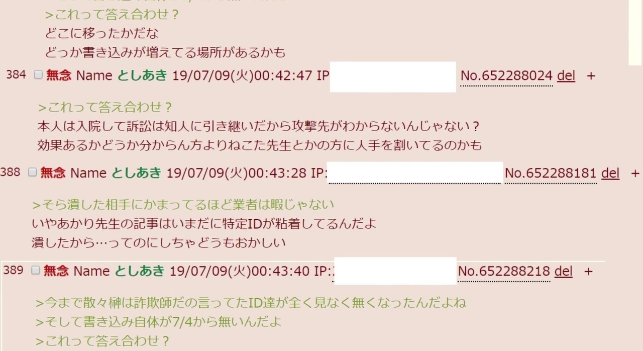 2019年1月に入ってから半年近く誹謗中傷にさらされ続けた榊正宗氏ですが、<br>入院してから「何故か」攻撃対象から外されている指摘がありました。<br>リソースが足りていないのでしょうか。<br><br>そして未だ続くあかり先生への誹謗中傷。<br><br>吉崎観音さん・細谷伸之さん・加藤英治さんによる共同声明を出すことがもっとも被害が少ない道だったのかもしれませんね。<br><br><span style="color: #800000; font-size: medium;">>テレ東、KADOKAWA、AGNが各自で火消し雇ってる感じかな<br><br>>そういえばテレ東株主総会の時に榊氏アンチスレが止まったとかあったね</span><br><br>スレ魚拓<br><a href="https://web.archive.org/save/https://may.2chan.net/b/res/652265374.htm" target="_blank" rel="noopener nofollow">https://web.archive.org/save/https://may.2chan.net/b/res/652265374.htm</a><br><br><br>おまけの細谷伸之氏のまとめ魚拓<br><a href="https://web.archive.org/web/20190708160340/https://may.2chan.net/b/src/1562601682158.jpg" target="_blank" rel="noopener nofollow">https://web.archive.org/web/20190708160340/https://may.2chan.net/b/src/1562601682158.jpg</a>