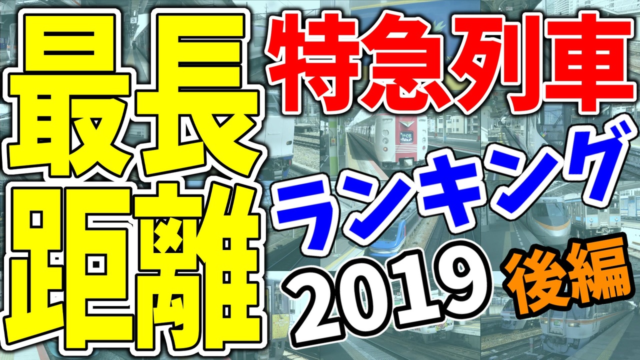 鉄道のちょっとした豆知識・ノウハウを紹介します!<br>最も長い距離を走る特に急がない列車の2019年版ランキングです。<br>ついにトップが揃います!上位陣は変動しているのか・・・?<br><br>ランキングに直行→ <a href="#" class="seekTime" data-seekTime="0:39" onclick="seekNicoPlayer('#0:39'); return false;">#0:39</a><br><br><br>NEXT → <a href="https://www.nicovideo.jp/watch/sm35409529" class="watch">sm35409529</a><br>PREV → <a href="https://www.nicovideo.jp/watch/sm35361593" class="watch">sm35361593</a> (最長距離2019前編)<br><br>【最長距離2018】前<a href="https://www.nicovideo.jp/watch/sm34731010" class="watch">sm34731010</a> 後<a href="https://www.nicovideo.jp/watch/sm35151375" class="watch">sm35151375</a><br><br>【鉄道豆知識】→ <a href="https://www.nicovideo.jp/mylist/63869025" target="_blank" rel="noopener">mylist/63869025</a><br><br>【18きっぷ2019春】→ <a href="https://www.nicovideo.jp/mylist/65053011" target="_blank" rel="noopener">mylist/65053011</a><br><br>【Part1全集マイリスト】→<a href="https://www.nicovideo.jp/mylist/63231980" target="_blank" rel="noopener">mylist/63231980</a><br><br>【Twitter】<a href="https://twitter.com/nagara_side" target="_blank" rel="noopener nofollow">https://twitter.com/nagara_side</a><br><br>【Youtube版】 ⇒ <a href="https://youtu.be/PTelYgWMW4Q" target="_blank" rel="noopener nofollow">https://youtu.be/PTelYgWMW4Q</a><br><br>==広告いただいた方々(敬称略)==(19.7.10まで)<br>JS研、明日か飾り、cygra、ふじ、明石入道、かーこんパンチ、<br>どりぃ、RAL、Necky TriStar、みなり月、おーにゃ、<br>wata、はいぱーあんくる、anomy、MINTIA、まぼろしの魚、<br>ぐっさん12、みどりの窓口、Tizona<br>==============================