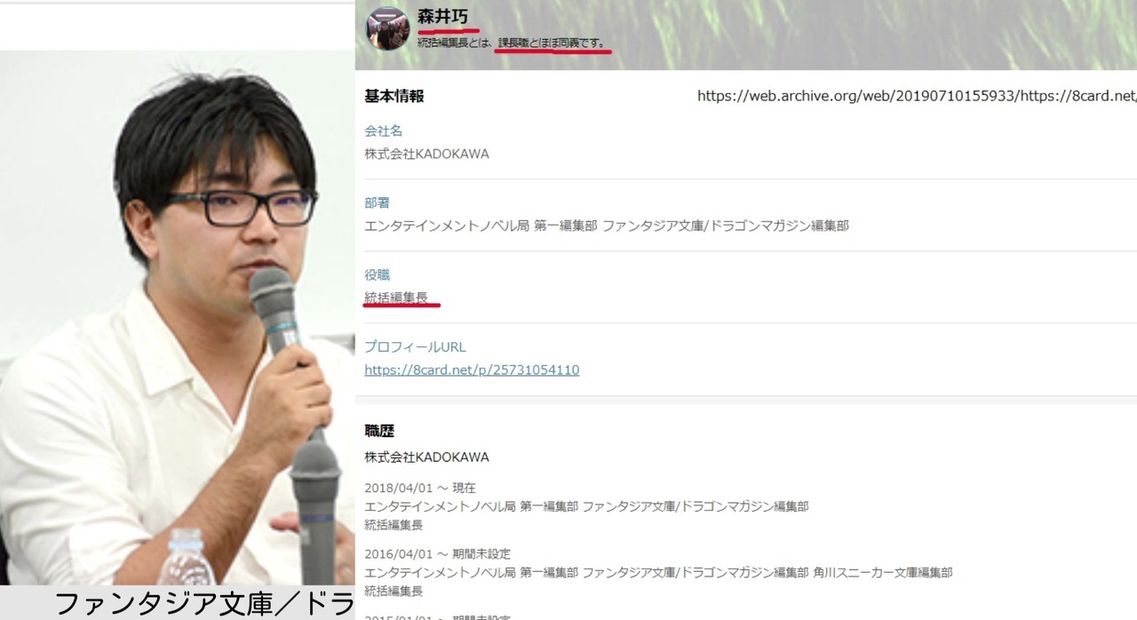 あらすじ<br><br>ある作家さんが「けもフレ騒動でたつき監督を擁護するツイートをRTしただけで富士見ファンタジアの森井巧・総括編集長が呼び出す」<br>→何故かアルファル兄貴なる無敵の人には甘いことで暴露される<br>→総括編集長が名刺を変えることでメッセージを送る。<br><br>たつき監督を支持するツイートをRTしただけで、統括編集長が怒ってるから出てこいとKADOKAWA本社に呼び出し食らった作家 #森井巧 <br><a href="https://www.nicovideo.jp/watch/sm35384440" class="watch">sm35384440</a><br><br>現在、森井氏の富士見ファンタジアが推してるのは「通常攻撃が全体攻撃で二回攻撃のお母さんは好きですか」<br><br>過去の魚拓<br><a href="https://web.archive.org/web/20190710162051/https://8card.net/p/25731054110" target="_blank" rel="noopener nofollow">https://web.archive.org/web/20190710162051/https://8card.net/p/25731054110</a><br><br>2019.7.11 14:06現在<br><a href="https://8card.net/p/25731054110" target="_blank" rel="noopener nofollow">https://8card.net/p/25731054110</a><br><br>素材<br><a href="https://www.amgakuin.co.jp/contents/p=26480" target="_blank" rel="noopener nofollow">https://www.amgakuin.co.jp/contents/p=26480</a><br><br><br><span style="color: #000000; font-size: 14px;">>誹謗中傷ってKADOKAWAが<br><br>KADOKAWAお抱え作家がwebアマチュア小説大賞の参加者をヒで虚偽の中傷<br>そこまでしてKADOKAWAはお咎め無しの判断<br>なのに9.25ではたつき擁護のツイートをRTしただけで編集長様がお出ましになったよねって矛盾を如月氏は漏らしたわけか</span>