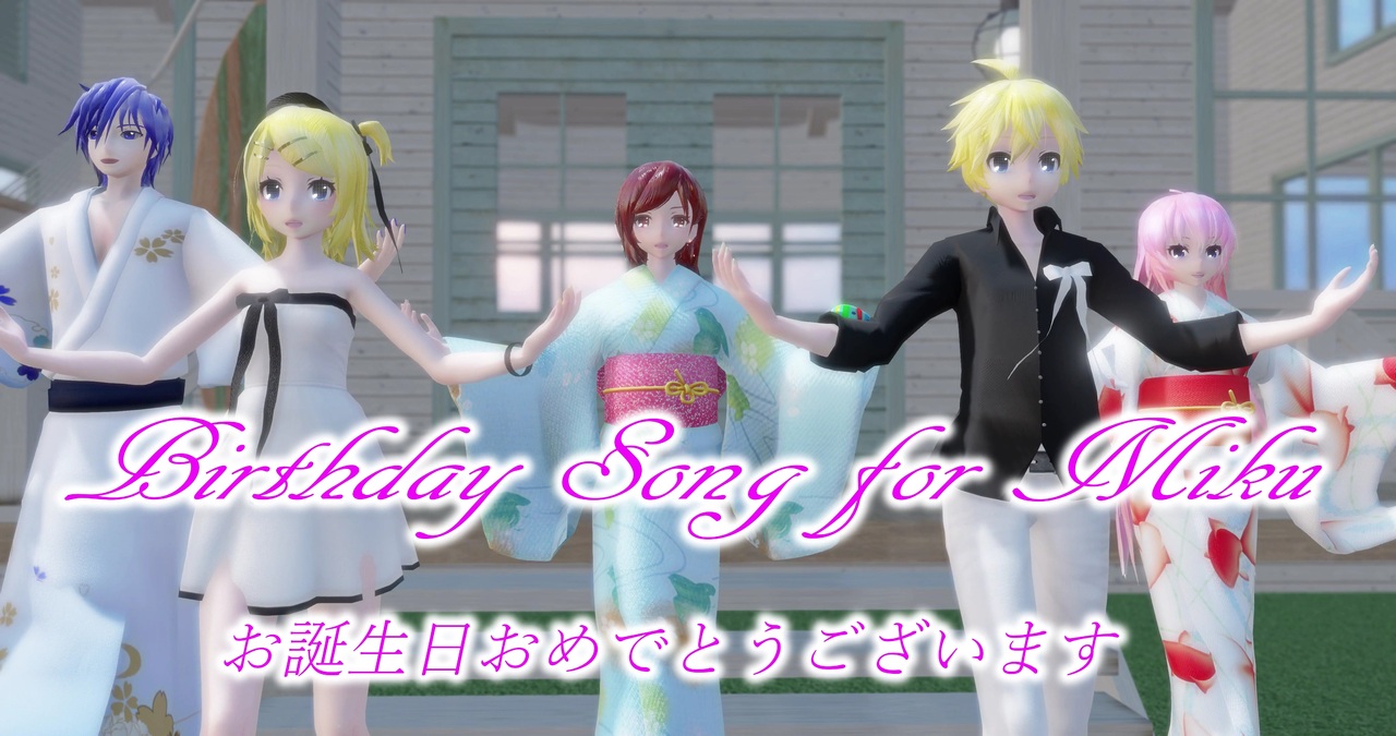 YouTube 4K 4096×2160 60fps<br><a href="https://www.youtube.com/watch?v=LfhcUvbeN30" target="_blank" rel="noopener nofollow">https://www.youtube.com/watch?v=LfhcUvbeN30</a><br>Music<br>原曲:Birthday Song for ミク<br>Mitchie M さん<br><a href="https://www.nicovideo.jp/watch/sm18396337" class="watch">sm18396337</a><br><br>Motion&Camera<br>足太ぺんた さん<br><a href="https://www.nicovideo.jp/watch/sm24827698" target="_blank" rel="noopener nofollow">https://www.nicovideo.jp/watch/sm24827698</a><br>モーション:浪潮小汐 さん(少しだけ改変しました)<br><a href="https://www.nicovideo.jp/watch/sm33794050" class="watch">sm33794050</a><br>カメラ:永远赤红的幼月さん(5人用に改変しました)<br><a href="https://www.bilibili.com/video/av30738356" target="_blank" rel="noopener nofollow">https://www.bilibili.com/video/av30738356</a><br><br>Stage<br>ビーチコテージ:まぁぼさん<br><a href="https://seiga.nicovideo.jp/seiga/im5897059" target="_blank" rel="noopener">im5897059</a><br>スカイドーム おぼろな朝空 TS8:怪獣対若大将Pさん<br><a href="https://seiga.nicovideo.jp/seiga/im6679846" target="_blank" rel="noopener">im6679846</a><br><br>Model<br>Tda MEIKO Yukata :by Murabito124さん<br><a href="https://www.deviantart.com/murabito124/art/MMD-Tda-MEIKO-Yukata-DL-691657149" target="_blank" rel="noopener nofollow">https://www.deviantart.com/murabito124/art/MMD-Tda-MEIKO-Yukata-DL-691657149</a><br>hzeo式kaito(着流しver):hzeoさん<br><a href="http://nonbirimattari721.blog.fc2.com/blog-entry-47.html" target="_blank" rel="noopener nofollow">http://nonbirimattari721.blog.fc2.com/blog-entry-47.html</a><br>TDA Rin Len elegant :by Yuu2002<br><a href="https://www.deviantart.com/yuu2002/art/TDA-Rin-Len-elegant-Download-MMD-540813259" target="_blank" rel="noopener nofollow">https://www.deviantart.com/yuu2002/art/TDA-Rin-Len-elegant-Download-MMD-540813259</a><br>TDA MIku Demetra :by MeikuRin さん<br><a href="https://www.deviantart.com/meikurin/art/MMD-TDA-MIku-Demetra-DOWNLOAD-757134154" target="_blank" rel="noopener nofollow">https://www.deviantart.com/meikurin/art/MMD-TDA-MIku-Demetra-DOWNLOAD-757134154</a><br>金子式振袖&浴衣:金子卵黄さん<br><a href="https://seiga.nicovideo.jp/seiga/im6365877" target="_blank" rel="noopener">im6365877</a><br><br>Effect<br>Ray-mmd 1.5.2 Ruiさん<br>ノーマルマップ ぐるみぃ さん<br>改変ディフュージョンフィルタ v0.5 おたもんさん<br>PowerDOF.fx v0.0.5 針金Pさん<br>AutoLuminous Ver.4.2 そぼろさん<br>空気遠近エフェクト 化身バレッタさん<br>ikClut_st026 ikenoさん<br><br>制作、配布なさってくれた方々に感謝しています。