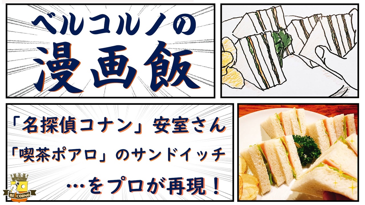 <span style="color: rgba(0, 0, 0, 0.8); font-size: 16px;">シェフが漫画・アニメ・映画に出てくる料理やスイーツを再現する「ベルコルノの漫画飯」。</span><br><br><span style="color: #000000; font-size: 14px;">【漫画飯】リスト:</span><span style="color: #006699; font-size: 14px;"><a href="https://www.nicovideo.jp/my/mylist/#/66008633" target="_blank" rel="noopener nofollow">https://www.nicovideo.jp/my/mylist/#/66008633</a></span><br><br><span style="color: rgba(0, 0, 0, 0.8); font-size: 16px;">今回は、「名探偵コナン」に出てくる、「喫茶ポアロ」安室さんのサンドイッチ!<br>安室さんが、実は真面目に?喫茶店のお仕事もこなしていたのが判明するエピソード。<br><br>本職のパン職人がそのレシピが知りたくて探ろうとしたという、絶品サンドイッチです。<br>(厳密には「サンドウィッチ」が正式な発音です)<br><br>その正体は、オリジナルの「味噌マヨネーズソース」を使ったハムサンド。他にも、ハムにオリーブオイルを塗ったり、パンを蒸したりといった工夫が凝らされ、意外と手がかかっています。美味しくするためでもあり、原価(材料費)も抑えるためでもありという「仕事」意識がしっかりと反映されたレシピであり、いち飲食店経営者から見ても、とても好感の持てるお仕事。こんな従業員いたら最高ですね!(笑)<br><br>簡単な作り方なので、忠実な再現を心がけながら、一つ一つの作業工程に解説をつけていく形で動画を作りました。<br><br>=~=~=~=~=~=~<br><br>【安室さんのサンドイッチ】レシピ<br><br>・パン(8枚切り食パン)… 4枚<br>・ハム(見切り品でOK)… 2枚<br>・レタス … 適量<br><br>・オリーブオイル … 適量<br>・マヨネーズ … 80g<br>・味噌 … 10g<br><br>・ポテトチップス … 5枚<br>・パセリ … 適量<br><br>=~=~=~=~=~=~<br><br>ベルコルノ(伊藤雄一) … Twitter / Instagram / Facebook の 各アカウントは「@BELCORNO」。ラテアートも得意とする、愛知県のイタリア料理「BELCORNO」のシェフ。ラテアート、お料理のお仕事依頼承ります。<br><br>店舗は 愛知県一宮市住吉2丁目9-2 TEL:0586-52-3567 E-mail:belcorno@gmail.com</span>