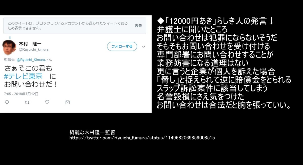 <span style="color: #14171a; font-size: 27px;">贋作が本物に劣ると誰が決めた</span><br><br><span style="color: #1b95e0; font-size: 18px;"><strong>木村 隆一 </strong></span><br>さぁそこの君も<br><span style="color: #1b95e0;">#テレビ東京</span> に<br>お問い合わせだ!<br><a href="https://twitter.com/Yosiyaahhhhhh/status/1149681100165242880" target="_blank" rel="noopener nofollow">https://twitter.com/Yosiyaahhhhhh/status/1149681100165242880</a><br><br>魚拓<br><a href="https://web.archive.org/web/20190712143349/https://twitter.com/Ruyuichi_Kimura/status/1149681100165242880" target="_blank" rel="noopener nofollow">https://web.archive.org/web/20190712143349/https://twitter.com/Ruyuichi_Kimura/status/1149681100165242880</a><br><br>「お問い合わせ」って迷惑行為にならない?<br><a href="https://kemono2.memo.wiki/d/%a1%d6%a4%aa%cc%e4%a4%a4%b9%e7%a4%ef%a4%bb%a1%d7%a4%c3%a4%c6%cc%c2%cf%c7%b9%d4%b0%d9%a4%cb%a4%ca%a4%e9%a4%ca%a4%a4%a1%a9" target="_blank" rel="noopener nofollow">https://kemono2.memo.wiki/d/%a1%d6%a4%aa%cc%e4%a4%a4%b9%e7%a4%ef%a4%bb%a1%d7%a4%c3%a4%c6%cc%c2%cf%c7%b9%d4%b0%d9%a4%cb%a4%ca%a4%e9%a4%ca%a4%a4%a1%a9</a><br><br>企業等への「お問い合わせ」について <br><br>◆「12000円あき」らしき人の発言↓<br>弁護士に聞いたところお問い合わせは犯罪にならないそうだ<br>そもそも<strong>お問い合わせを受け付ける専門部署にお問い合わせすることが業務妨害になる道理はない</strong><br>更に言うと企業が個人を訴えた場合「脅し」と捉えられて逆に賠償金をとられるスラップ訴訟案件に該当してしまう<br>名誉毀損にさえ気をつけたお問い合わせは合法だと胸を張っていい。<br><br>おまけ<br><a href="https://twitter.com/Ryuichi_Kimura/status/1149682069859008515" target="_blank" rel="noopener nofollow">https://twitter.com/Ryuichi_Kimura/status/1149682069859008515</a>