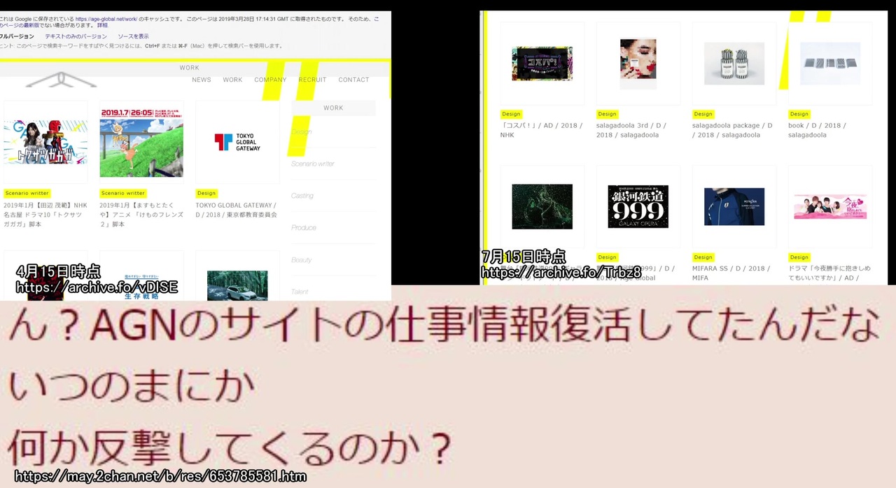 ん?AGNのサイトの仕事情報復活してたんだな<br>いつのまにか<br><span style="font-size: 24px;"><strong>何か反撃してくるのか?</strong></span><br><br>AGNの仕事情報再掲載ってあったけど近く新企画あるのかな?<br><br>AGNの業務情報復活したのか<br>今まで消してたのに<br>もしかして逃げ切られた?<br><br><span style="font-size: 24px;"><strong>テレ東や細いのまたはムクになすりつけ確定してAGNだけが安泰な目星付いたのかも?</strong></span><br>タロットあきたちの塔や15日の何かはそこかも<br><br><span style="font-size: 16px;"><strong>AGN逃げたか…<br><br>むしろこれから始まるのかもしれんよ<br>AGNの地獄が</strong></span><br><br>天罰は下るべき所に下る<br>世間から逃げられても運命から逃げられると思うなAGN<br><br>ヤクザのコネを利用して脚本家をアニメ映画ドラマの制作現場に食い込ませてあらゆるテレビ局に顔を利かせてるヤバい会社って明るみになっちゃったけどAGNはこれからどうするんだろう<br>3ヶ月無視してる加藤英治オブザヤクザも実はもうとっくに死んでたりしないかちょっと心配ではない<br><br>うんこルーザー<br><span style="color: #dd0000; font-size: medium;"><a href="http://may.2chan.net/del.php?b=b&d=653835320" target="_blank" rel="noopener nofollow">http://may.2chan.net/del.php?b=b&d=653835320</a></span><br><span style="font-size: medium;"><a href="http://may.2chan.net/del.php?b=b&d=653834740" target="_blank" rel="noopener nofollow">http://may.2chan.net/del.php?b=b&d=653834740</a></span><br><span style="color: #800000; font-size: medium;">追いdel用</span><br><br><br>AGN仕事情報7月15日時点(魚拓)<br><a href="https://archive.fo/Trbz8" target="_blank" rel="noopener nofollow">https://archive.fo/Trbz8</a><br><br>AGN仕事情報4月15日時点(魚拓)<br><a href="https://archive.fo/vDlSE" target="_blank" rel="noopener nofollow">https://archive.fo/vDlSE</a><br><br>URL<span style="font-size: 18px;"><strong>(コピペ用。危険ですので踏まないでください)</strong></span><br><a href="https://age-global.net/work/" target="_blank" rel="noopener nofollow">https://age-global.net/work/</a>