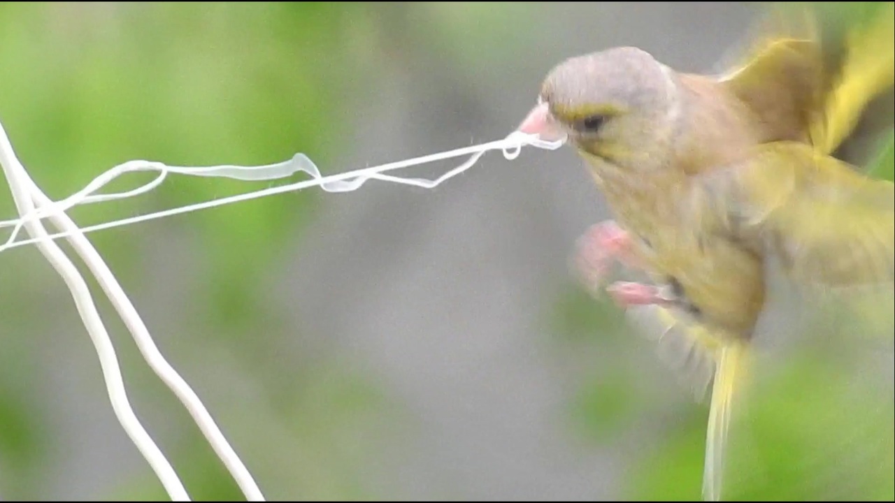 電柱に絡まったひも(凧ひも?)を引っ張ってとろうとしているカワラヒワの様子。巣材にしたいらしい。撮影前後に渡り20分以上格闘していたが複雑に絡まっているので外せなかった。周囲にも複数のカワラヒワがいた。ハトやカラスは特定のものに執着することがあるが、カワラヒワのような小鳥でも執着心があるらしい。[2019/6下旬、中部地方市街地](鳴き声;<a href="https://www.nicovideo.jp/watch/sm35057439" class="watch">sm35057439</a>)