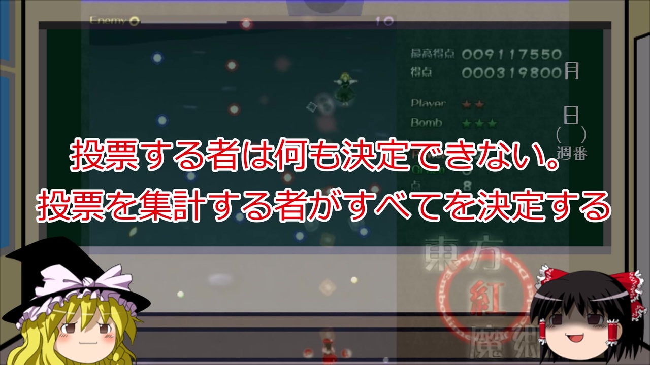 みーのゆっくり先生ちゃんねる 様<br>【ゆっくり解説】選挙ってホントに意味ないの? <a href="https://youtu.be/BWJXOJBCttI" target="_blank" rel="noopener nofollow">https://youtu.be/BWJXOJBCttI</a><br>今回の動画の内容は全てこの動画を見ていることを前提とした内容です。「政治家の質は、国民の質」。<br>この人の方が100倍おもしろい解説動画を作っていらっしゃるのでこれだけ見てもいいです(じゃあなんで今回の動画作ったし)。<br><br>ゆっくりゴシップチャンネル 様<br>【ゆっくり解説】番外 おう投票あくしろよホラホラホラホラ(選挙) <a href="https://youtu.be/I2_z388E39k" target="_blank" rel="noopener nofollow">https://youtu.be/I2_z388E39k</a><br>この動画は今回の動画の参考にはしていませんがおもしろかったのでぜひ。私の動画よりおすすめです(ホントになんで今回の動画作ったし)。<br><br>ええ。説明文で言うことなかったんです。認めます。<br><br>YouTube版:<a href="https://youtu.be/bZtIsOG7dx0" target="_blank" rel="noopener nofollow">https://youtu.be/bZtIsOG7dx0</a><br><br />質問・ご指摘はmenndouyukkuri@yahoo.co.jpまでお願いします。<br>Twitter:<u><a href="https://twitter.com/Kurumi_Kyoden" target="_blank" rel="noopener nofollow">https://twitter.com/Kurumi_Kyoden</a></u><br>めんどうゆっくりのほしいものリスト:<u><a href="https://amzn.asia/6PKzpwZ" target="_blank" rel="noopener nofollow">https://amzn.asia/6PKzpwZ</a></u>