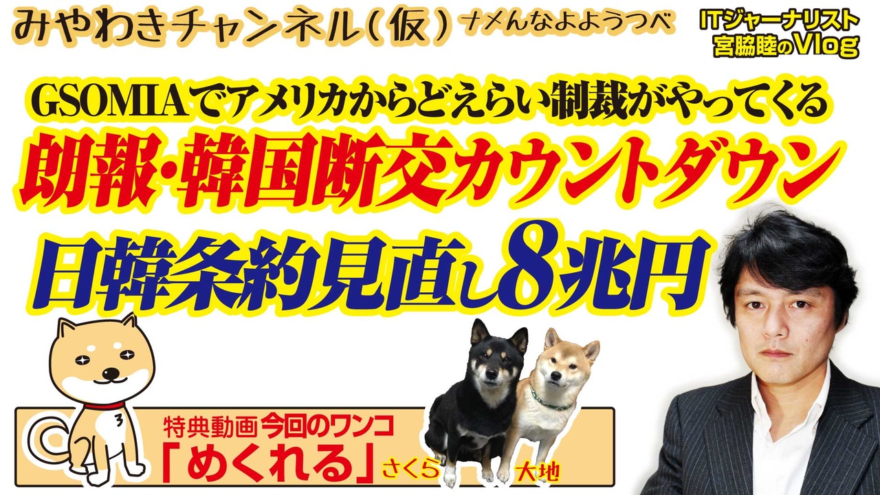 朗報・韓国断交カウントダウン。<br>アメリカからどえらい制裁がやってくる「GSOMIA」。<br>日韓基本条約見直しで8兆円返せ。<br><br>0:08 日韓関係は次のステップに移りました<br>2:10 日本と韓国の直近の4つの問題を検証<br>5:06 請求権の請求先を語らないズルイ青木さん<br>7:53 青木「日韓基本条約を見直せ」。大歓迎!<br>11:32 韓国のGSOMIAとは「ブーメラン」<br>14:36 今回のワンコ「めくれる」<br><br>みやわきチャンネル(仮)#517Restart376<br>(旧・マスコミでは言えないこと)<br>オリジナル2019年7月19日配信<br><br>番組の最後に「柴犬」のコーナーがあります。<br><br><br>■わんこ総集編はこちらから!<br>何かあっても大丈夫、のはず。仮にこの「ワンコチャンネル」になにかあれば・・・オッス、○○と。<br>今回のワンコ総集編〜さくら&大地〜<br><a href="https://www.youtube.com/channel/UChwY..." target="_blank" rel="noopener nofollow">https://www.youtube.com/channel/UChwY...</a><br><br>■ニコニコ動画<br><a href="http://www.nicovideo.jp/user/13610165" target="_blank" rel="noopener nofollow">http://www.nicovideo.jp/user/13610165</a><br>■FRESH LIVE<br><a href="https://freshlive.tv/miyawaki-ch" target="_blank" rel="noopener nofollow">https://freshlive.tv/miyawaki-ch</a><br>■FC2動画<br><a href="https://video.fc2.com/account/16696711" target="_blank" rel="noopener nofollow">https://video.fc2.com/account/16696711</a><br>■YouTube(理不尽に消えることあり)<br><a href="https://www.youtube.com/c/AtsushiMiyawaki" target="_blank" rel="noopener nofollow">https://www.youtube.com/c/AtsushiMiyawaki</a><br><br>■いつ「消える」かわかりません。<br>そこでオフィシャルサイトで「非常用連絡先」をご確認ください。<br>「みやチャン(仮)」公式サイト「MiyawakiNewsNetwork」<br><a href="http://www.miyawakiatsushi.net" target="_blank" rel="noopener nofollow">http://www.miyawakiatsushi.net</a><br><br>■理不尽に消えたとき、以下で情報配信しております。ぜひ、ご登録ください。<br><br>■ツイッター<br><a href="https://twitter.com/miyawakiatsushi" target="_blank" rel="noopener nofollow">https://twitter.com/miyawakiatsushi</a><br>■Facebook<br><a href="https://www.facebook.com/miyawakiatsushi" target="_blank" rel="noopener nofollow">https://www.facebook.com/miyawakiatsushi</a>