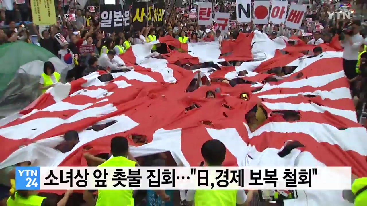 巨大な旭日旗をみんなで破るパフォーマンスまで・・・こいつら本当は旭日旗大好きなんじゃないの?w <br><br>YTN報道のGoogle翻訳です。<br><br>昔の日本大使館の近くの平和の少女像の前で、日本政府の経済報復を糾弾するキャンドル集会が開かれました。<br><br>民衆共同行動は、今日(20日)午後6時、ソウル鍾路区旧在韓日本大使館の前にある平和の少女像の前で集会を開き、日本政府に向けて経済報復を撤回するよう叫びました。<br><br>市民団体側は、日本政府が戦争を行った過去の歴史について謝罪せず、強制徴用者に対する賠償判決ではなく、経済報復に答えた批判しました。<br><br>また、主催側は国内の一部メディアが、日本政府の主張を合理的に確定より、そのまま入れたと、日本側の主張に同調していると主張した。<br><br>今日の集会には、市民団体90個市民千人が参加しました。<br><br>集会の関係者は、光化門広場などで日本政府を糾弾するキャンドル集会を毎週継続する予定だと言いました。