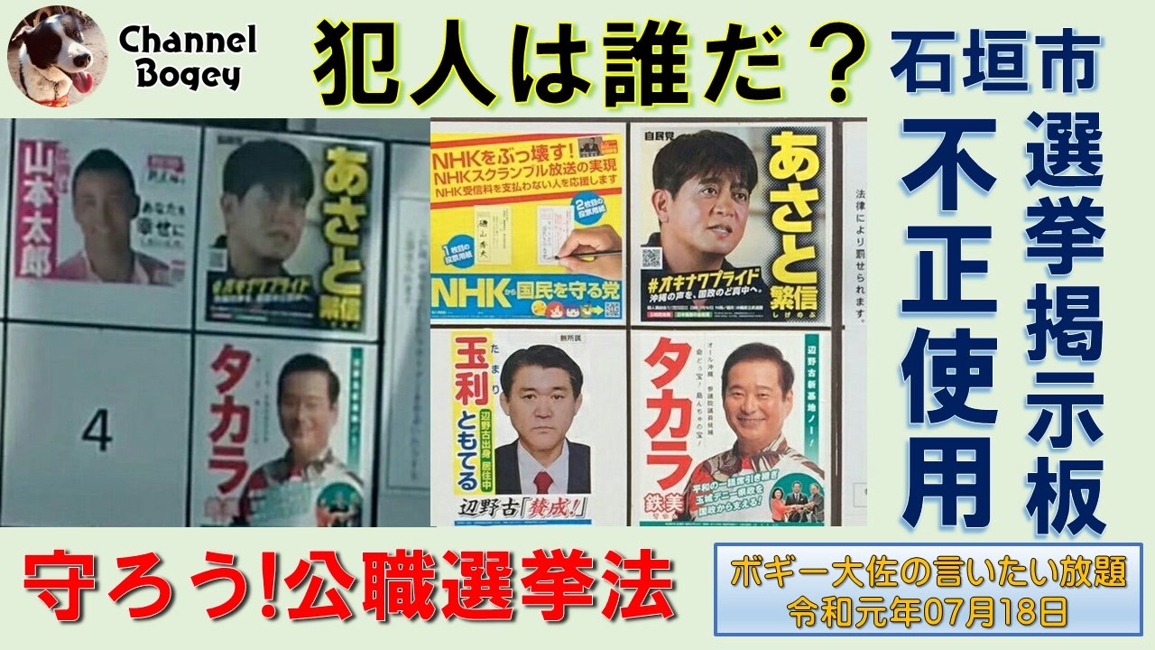 2019年07月18日(木)21時放送の #ボギーチャンネル です。<br><br>本日の放送は、県がまた国交省を相手に裁判を起こすようです。そして、今日の沖縄の選挙の沖縄タイムスの誘導記事についてと、沖縄選挙区に立候補していない人が法定看板にポスターを貼っていた問題についてです。詳細は動画をご覧ください。<br><br>ボギ-チャンネル公認Twitterです。<br><a href="https://twitter.com/ChannelBogey?lang=ja" target="_blank" rel="noopener nofollow">https://twitter.com/ChannelBogey?lang=ja</a><br><br>沖縄の真実を伝えるボギーチャンネルは毎日21時からツイキャス放送中。<br><a href="http://twitcasting.tv/c:bogey_channel" target="_blank" rel="noopener nofollow">http://twitcasting.tv/c:bogey_channel</a><br><br>依田啓示さんをサポートする会のページです。<br><a href="http://supportyodakeiji.ti-da.net/e9913732.html" target="_blank" rel="noopener nofollow">http://supportyodakeiji.ti-da.net/e9913732.html</a><br><br>カナン基金のサイトはこちらです。<br><a href="https://project.canaan-farm.com/?fbclid=IwAR3QdpqaSgB33POhrqjiiaS2c0vn5aS7uxE1XUbn_UJpsUJjmpGymSo4n2I" target="_blank" rel="noopener nofollow">https://project.canaan-farm.com/?fbclid=IwAR3QdpqaSgB33POhrqjiiaS2c0vn5aS7uxE1XUbn_UJpsUJjmpGymSo4n2I</a>