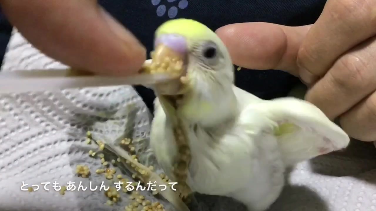 ピロロが、こんなに早く動くなんてε-(´∀`; )<br>続けざまで、呆れられちゃいますね…ただ、次に巡り会えるか解らない品種の子だったので、もう、直ぐに動いてしまいましたw<br>シルバーが元気になって、一人餌になっててくれて良かった(*´-`)<br>という訳で『スパングル・ダブルファクター・クリーム』のサルファー君です。(ちょっと自信はないけど男の子かな) よろしくお願いしますm(_ _)m<br>※ スパングル・ダブルファクターとは…通常、白(アルビノ)、黄(ルチノー)、薄黄色(クレミノ、クリームイノ)の子は赤目ですよね。スパングル種(ウロコ模様が細い線になった品種)の中で遺伝子の関係で無地で黒目の子がいるのです。 白×黒目…ホワイト、黄×黒目…イエロー、薄黄色×黒目…クリームになります。<br>た、たぶん説明あっているはず…間違えていたら、ごめんなさい。<br>今回、改めてdfについて調べたら、モリオンのろう膜は青…あはは、ルチノーじゃなくイエローでした! ホワイト(パール♀故)、イエロー(モリオン♂)、クリーム(サルファー♂)で、dfをコンプリートしてましたw<br>※ シルバーの時にご心配をお掛けしたので、今回はサルファーが安定してからの紹介になりましたm(_ _)m<br>※ シルバーの病気が安定してすぐのお迎えは、私自信にも抵抗はありましたが、今は良かったと思っています。<br>かなり育雛(日々の観察にも)に自信をなくしていたところがあったので、サルファーに良いリハビリをさせて貰っています。<br>同じ時期にセキセイとジャンボという個性の違う品種のヒナちゃんを見るのも勉強になりますね!<br>※ 「ナイス!ボーロ!」とは、わが家のねーちゃんのセキセイさんに対するフェチの一つですw イエローフェイスのグラデーションのキレイなお菓子のボーロみたいな子に対する賞讃する言葉なのです。<br>※ ここにきて女の子疑惑が出てきてるかも…女の子特有のツンとする匂いがしてきた気が…さぁ、どちらになるでしょう(^◇^;) (発情期以外の匂いの差があると思うんですけど、同じように感じる方いらっしゃいますか?)<br><br>主演…セキセイ:サルファー (スパングル・ダブルファクター・クリーム)<br> ジャンボセキセイ: シルバー(グレー、オパーリン)<br><br>ピロロ \(・∀・)/ ピロロ <a href="https://www.nicovideo.jp/mylist/65969410" target="_blank" rel="noopener">mylist/65969410</a><br>宝石の鳥 <a href="https://www.nicovideo.jp/mylist/62527544" target="_blank" rel="noopener">mylist/62527544</a>