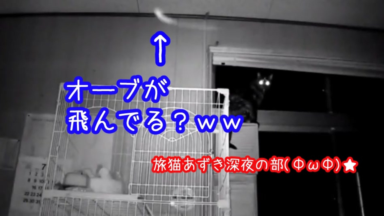 真夜中の旅猫あずきちゃんのキャプチャー動画です(*´∀`*)<br>毎晩、換気扇の上などで自宅警備をしています。<br><br>赤外線モードの時に白い物体がよく飛んでいるのが見れます。<br>恐らく虫か、大きな埃か、はたまた…?(w<br><br><span style="color: #000000; font-size: 14px;">◆旅猫あずき ニコニコ動画</span><br><span style="color: #006699; font-size: 14px;"><a href="https://com.nicovideo.jp/community/co1723480" target="_blank" rel="noopener nofollow">https://com.nicovideo.jp/community/co1723480</a></span><br><br><span style="color: #000000; font-size: 14px;">◆旅猫あずきさんのチャンネルはこちら↓</span><br><span style="color: #006699; font-size: 14px;"><a href="https://www.youtube.com/channel/UC54yID0Fy1k5G6oDS_fxE1w" target="_blank" rel="noopener nofollow">https://www.youtube.com/channel/UC54yID0Fy1k5G6oDS_fxE1w</a></span><br><br><span style="color: #000000; font-size: 14px;">#猫<br>#cat<br>#サビ猫<br>#旅猫</span>