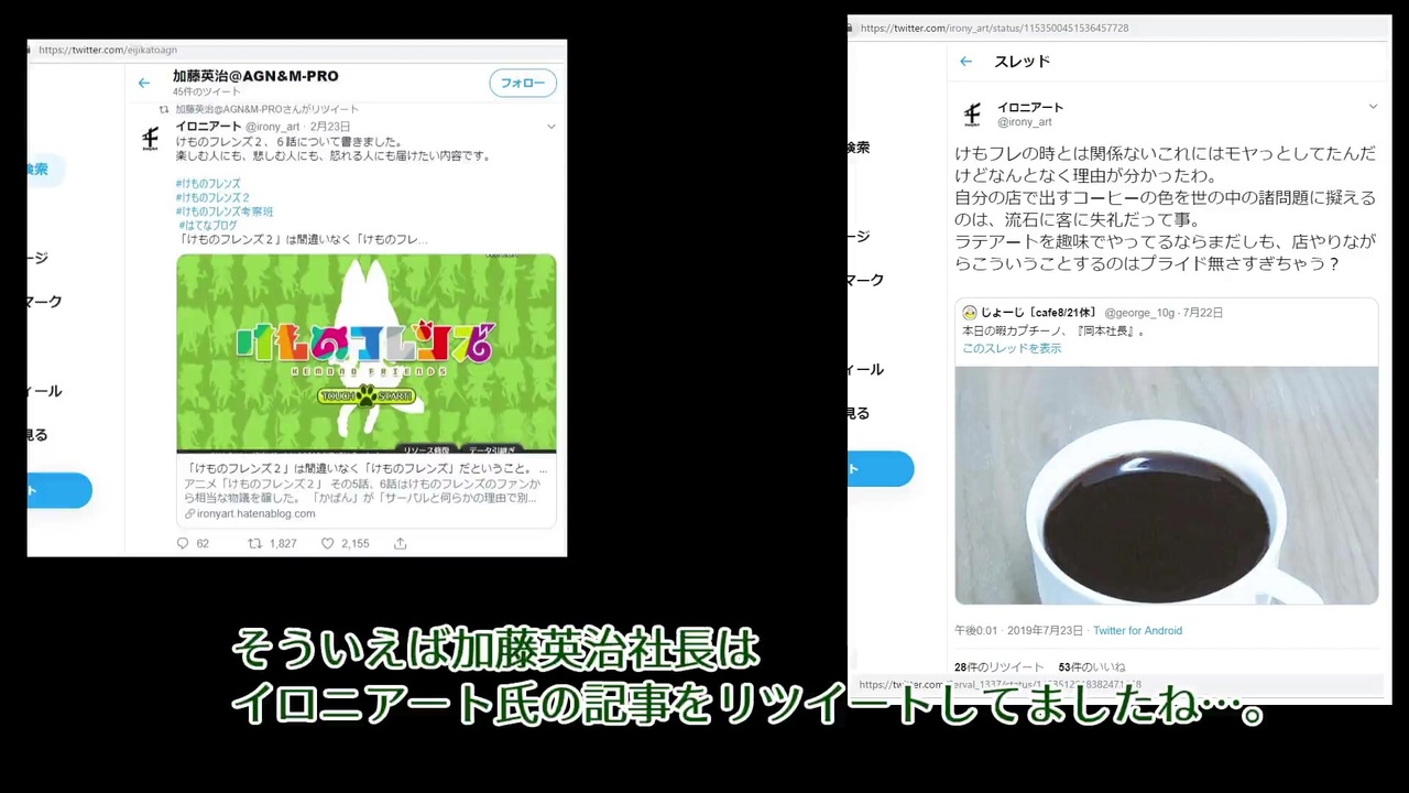 事実まとめ<br>・岩田俊彦氏はコーヒーに傷ついた<br>・加藤英治社長は岩田俊彦氏の発言をけものフレンズちゃんねるが取り上げたら即座に呼び出すくらい岩田氏を愛している<br>・加藤英治社長はイロニアート氏の提灯記事をリツイートしている。<br>・氷村ふぁねる氏はイロニアート氏を身内のように扱っていた。<br><br><br>画像まとめ<br><a href="https://web.archive.org/web/20190724073220/https://may.2chan.net/b/src/1563952087151.jpg" target="_blank" rel="noopener nofollow">https://web.archive.org/web/20190724073220/https://may.2chan.net/b/src/1563952087151.jpg</a><br><br><br><br>イロニアート @irony_art<br>けもフレの時とは関係ないこれにはモヤっとしてたんだけどなんとなく理由が分かったわ。<br>自分の店で出すコーヒーの色を世の中の諸問題に擬えるのは、流石に客に失礼だって事。<br>ラテアートを趣味でやってるならまだしも、店やりながらこういうことするのはプライド無さすぎちゃう?<br><a href="https://archive.fo/5aoO1" target="_blank" rel="noopener nofollow">https://archive.fo/5aoO1</a><br><br>村正レイ @Serval_1337<br>ネタ切れかお手軽に社会風刺()としてバズれることに気づいてしまったんでしょうなぁ…<br><a href="https://archive.fo/5iSCE" target="_blank" rel="noopener nofollow">https://archive.fo/5iSCE</a><br><br>イロニアート @irony_art<br>コーヒーは社会風刺の道具じゃない、食べ物で遊ぶな!<br><a href="https://archive.fo/kllEl" target="_blank" rel="noopener nofollow">https://archive.fo/kllEl</a><br><br><br>イロニアート@irony_art<br>もし自分が飲食店やるとして、「自分のコーヒーの色は世の中の闇を現してるんですよ」とは口が裂けても言えない、客を馬鹿にしてるし、なによりコーヒー農家にも失礼。<br><a href="https://archive.fo/9jhoH" target="_blank" rel="noopener nofollow">https://archive.fo/9jhoH</a><br><br>イロニアート @irony_art<br>twitterでバズる事は、そういう当たり前の価値観をここまで歪めるって事の良い例だと思う。<br><a href="https://archive.fo/z7KCn" target="_blank" rel="noopener nofollow">https://archive.fo/z7KCn</a><br><br><br>スレ魚拓<br><a href="https://web.archive.org/save/https://may.2chan.net/b/res/656291655.htm" target="_blank" rel="noopener nofollow">https://web.archive.org/save/https://may.2chan.net/b/res/656291655.htm</a>