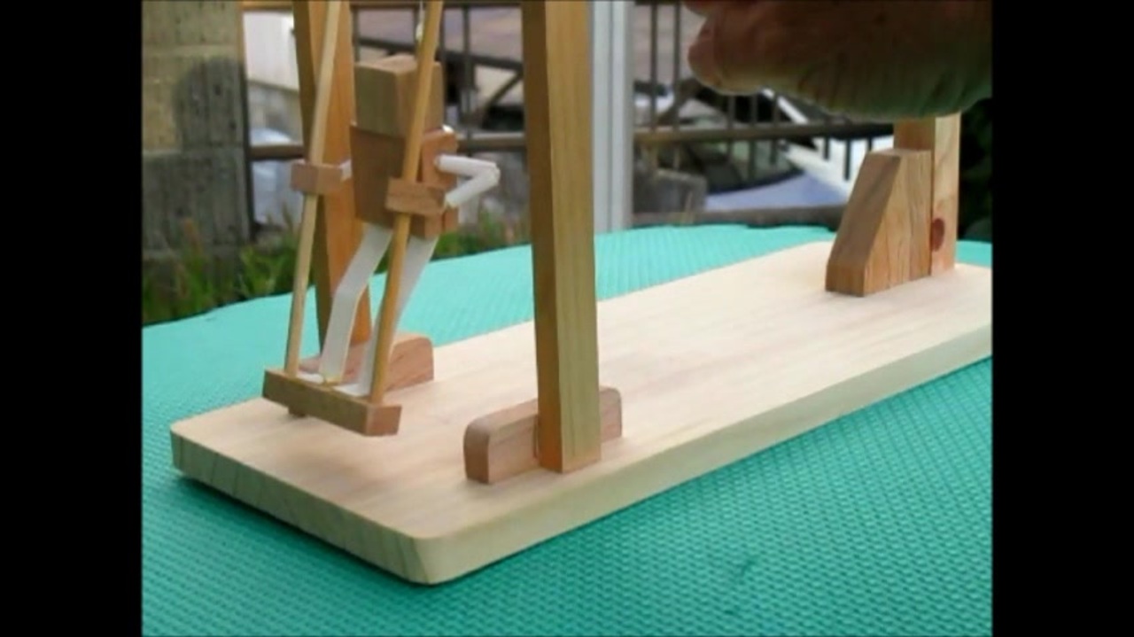 ブランコをこぐには、どの位置で、どの様に体重移動すると振れが大きくなるか?。<br>何人か、この動きを再現・実験する木のおもちゃを作られていますが、皆さん人型人形を<br>どの様にして遠隔で動かすかかなり試行錯誤しているみたい。皆さん鉄棒の大車輪みたいに<br>させたいため、遠隔のひもを回転軸の中を通して動かしています。この方法だとひもが過度に<br>ねじれたり、摩擦で動きが悪くなったり色々なトラブルの原因になっているみたい。<br>私もこの方法でやってみましたが、このトラブル解決のアイデアが浮かばず、大車輪を諦め<br>単純なブランコ、大車輪なしで作ってみました。<br>この体重移動で合っているのか?、頭の中でイメージ、思いだせない。<br>実際にブランコに乗って近いうちに実験してみたい。
