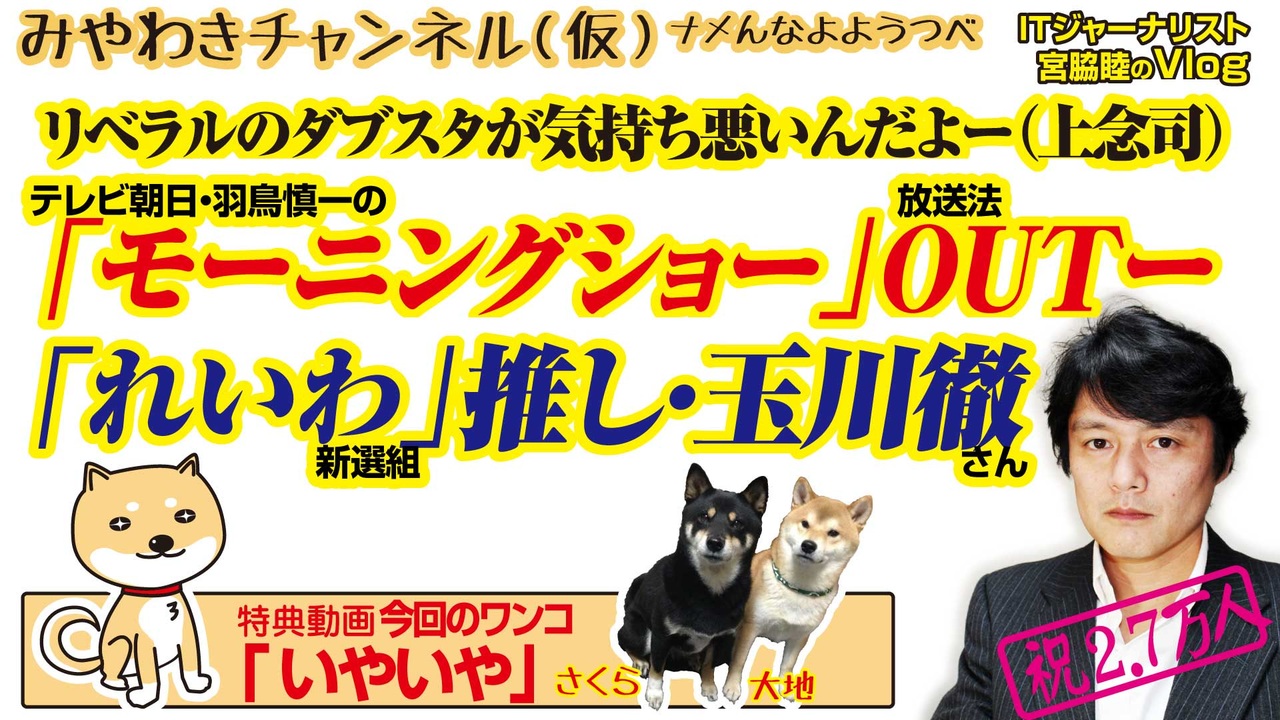 テレビ朝日社員・玉川徹さん「れいわ新選組」推し。<br>放送法違反的特定政党の主張を垂れ流す「羽鳥慎一のモーニングショー」。<br>「リベラルのダブスタが気持ち悪いんだよー(上念司)」<br><br>0:23 放送法をまるっと無視のモーニングショー<br>2:50 「れいわ新選組」は世界的潮流である<br>4:58 低投票率をまるっと無視するテレ朝・玉川<br>7:36 20代の貯蓄ゼロが60%モーニングショー<br>10:17 日本メッつぼー!?が見え隠れする「れいわ」<br>13:48 今回のワンコ「いやいや」<br><br>みやわきチャンネル(仮)#523Restart382<br>(旧・マスコミでは言えないこと)<br>オリジナル2019年7月25日配信<br><br>番組の最後に「柴犬」のコーナーがあります。<br>今回のワンコ「いやいや」<br><br>■わんこ総集編はこちらから!<br>何かあっても大丈夫、のはず。仮にこの「ワンコチャンネル」になにかあれば・・・オッス、○○と。<br>今回のワンコ総集編〜さくら&大地〜<br><a href="https://www.youtube.com/channel/UChwY..." target="_blank" rel="noopener nofollow">https://www.youtube.com/channel/UChwY...</a><br><br>■ニコニコ動画<br><a href="http://www.nicovideo.jp/user/13610165" target="_blank" rel="noopener nofollow">http://www.nicovideo.jp/user/13610165</a><br>■FRESH LIVE<br><a href="https://freshlive.tv/miyawaki-ch" target="_blank" rel="noopener nofollow">https://freshlive.tv/miyawaki-ch</a><br>■FC2動画<br><a href="https://video.fc2.com/account/16696711" target="_blank" rel="noopener nofollow">https://video.fc2.com/account/16696711</a><br>■YouTube(理不尽に消えることあり)<br><a href="https://www.youtube.com/c/AtsushiMiyawaki" target="_blank" rel="noopener nofollow">https://www.youtube.com/c/AtsushiMiyawaki</a><br><br>■いつ「消える」かわかりません。<br>そこでオフィシャルサイトで「非常用連絡先」をご確認ください。<br>「みやチャン(仮)」公式サイト「MiyawakiNewsNetwork」<br><a href="http://www.miyawakiatsushi.net" target="_blank" rel="noopener nofollow">http://www.miyawakiatsushi.net</a><br><br>■理不尽に消えたとき、以下で情報配信しております。ぜひ、ご登録ください。<br><br>■ツイッター<br><a href="https://twitter.com/miyawakiatsushi" target="_blank" rel="noopener nofollow">https://twitter.com/miyawakiatsushi</a><br>■Facebook<br><a href="https://www.facebook.com/miyawakiatsushi" target="_blank" rel="noopener nofollow">https://www.facebook.com/miyawakiatsushi</a>