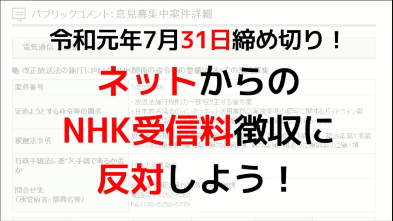7月31日締め切りで、ネットからのNHK受信料徴収を正当化するパブリックコメントの募集が下記のページで行われています。<br><br><a href="https://search.e-gov.go.jp/servlet/Public?CLASSNAME=PCMMSTDETAIL&id=145209349&Mode=0&fbclid=IwAR3Z7jElU3AVh2HMNeVZ7OA1oeucyYF3UnHOS1Nh9klQEYfbuAPkJBDRjAU" target="_blank" rel="noopener nofollow">https://search.e-gov.go.jp/servlet/Public?CLASSNAME=PCMMSTDETAIL&id=145209349&Mode=0&fbclid=IwAR3Z7jElU3AVh2HMNeVZ7OA1oeucyYF3UnHOS1Nh9klQEYfbuAPkJBDRjAU</a><br><br>募集開始が7月2日、締め切りが31日と、参議院議員選挙にかぶせてあまり話題にならないうちに、「ほーら反対意見があんまり出なかったよ、民意によって認められたよ」とアピールしようという意図を疑ってしまいます。<br><br>以下、例文を掲載します。<br><br>—例文—<br><br>今回パブリックコメントとして意見が募集されている下記3件について、強く反対します。<br>・放送法施行規則の一部を改正する省令案<br>・日本放送協会のインターネット活用業務の実施基準の認可に関するガイドライン案<br>・日本放送協会の子会社等の事業運営の在り方に関するガイドライン案<br><br>まだ放送インフラが整っていなかった時代に作られた放送法を盾に行われている、NHKによる押し売りを拡大するようなことには断固反対です。<br><br>NHKのあり方に強い疑問を呈する「NHKから国民を守る党」が既に地方議会で次々と議席を獲得し、先の参議院議員選挙でも1議席を獲得しているという事実を鑑みれば、その民意に逆行する施策であることは明らかです。