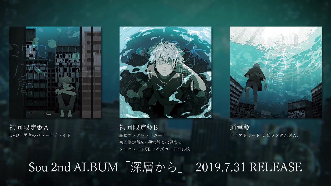 <span style="color: #0a0a0a; font-size: 14px;">2019.7.31 Release<br>Sou 2nd New Album『深層から』全曲試聴クロスフェード<br><br><br>■初回限定盤A[CD+DVD]¥2,700+税 /TYCT-69156<br>■初回限定盤B[CD+豪華ブックレットカード]¥2,700+税 / TYCT-69157<br>■通常盤[CD]¥2,300+税 / TYCT-69158</span><br><br>その他店舗別特典などは特設サイトをチェック!<br><br><a href="https://sou-official.jp/2nd_album/" target="_blank" rel="noopener nofollow">https://sou-official.jp/2nd_album/</a><br><br><br><br><span style="color: #000000; font-size: 14px;">収録曲<br>01. 愚者のパレード / Sou <br>02. トーキョーゲットー / Eve<br>03. ハングリーニコル / 煮ル果実<br>04. 鯰 / 羽生まゐご </span><span style="color: #4a86e8;"><i>New!</i></span><br><span style="color: #000000; font-size: 14px;">05. flos / R Sound Desigh<br>06. ノイド / Sou<br>07. シンソウ / 有形ランペイジ </span><span style="color: #4a86e8; font-size: 13px;"><i>New!</i></span><br><span style="color: #000000; font-size: 14px;">08. 波に名前をつけること、僕らの呼吸に終わりがあること。 / こんにちは谷田さん<br>09. エリカ / あめのむらくもP<br>10.グレイの海 / Eve </span><span style="color: #4a86e8; font-size: 13px;"><i>New!</i></span><br><span style="color: #000000; font-size: 14px;">11. Q / 椎名もた <br>12. 心做し / 蝶々P <br>13. 証として / 蝶々P </span><span style="color: #4a86e8; font-size: 13px;"><i>New!</i></span><br><br>※敬称略<br><span style="color: #0a0a0a; font-size: 14px;">※CD収録内容は共通です</span><br><br>