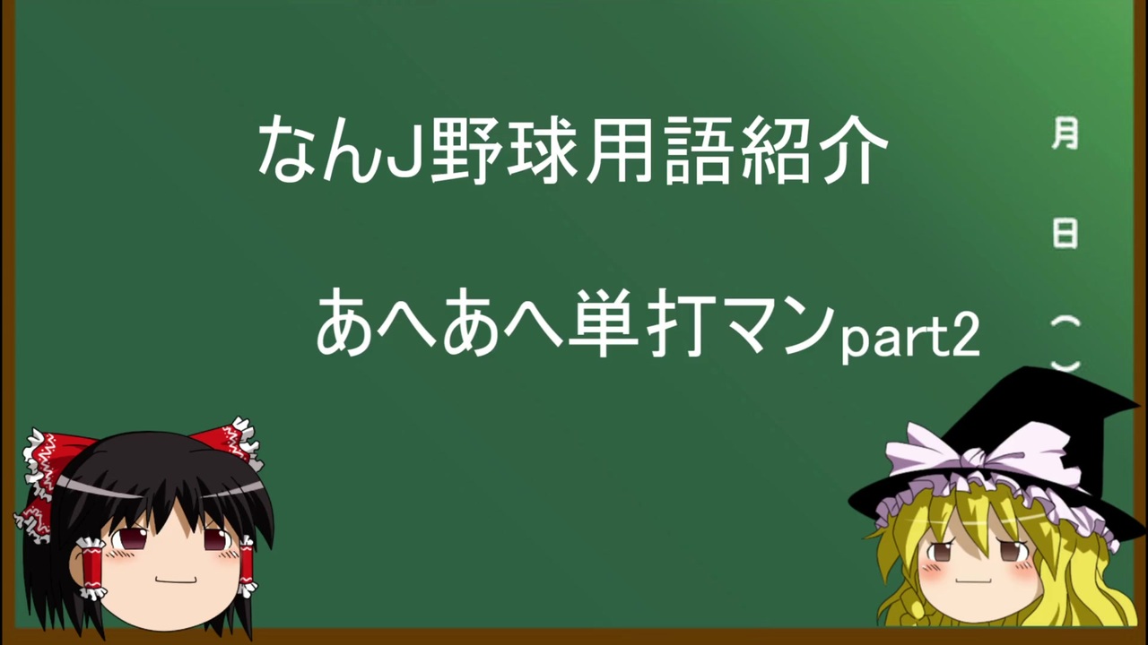 本日のお題は「あへあへ単打マンpart2」<br><br>次回のお題 「2018ねんあへあへ単打マン値ランキング セ・リーグ編」 <a href="https://www.nicovideo.jp/watch/sm35469285" class="watch">sm35469285</a><br>前回のお題 「あへあへ単打マン」 <a href="https://www.nicovideo.jp/watch/sm35451505" class="watch">sm35451505</a><br>今までのなんJ野球用語紹介 <a href="https://www.nicovideo.jp/series/36038" target="_blank" rel="noopener">series/36038</a>