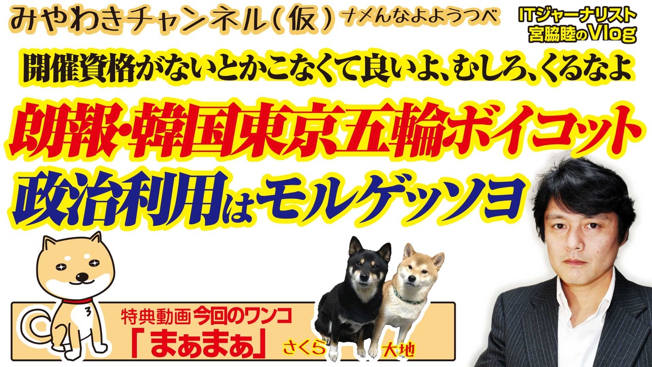 【朗報】韓国の国民に選ばれた国会議員が「東京五輪の資格がない」と、オリンピックボイコットを予告。<br>スポーツの政治利用は文在寅大統領の得意技。スウェーデンでの卑怯な「ワンコリア」。<br>モルゲッソヨは、むしろ、くるなよ。<br><br>0:51 世界から孤立の道を驀進中の世界の韓国<br>3:16 韓国「東京オリンピック」ボイコット<br>5:22 韓国議員のアレと今年も福島は旨かった<br>7:04 スポーツの政治利用を絶賛した共同と青木<br>9:56 天晴れ日本女子!ゲスな吉本騒動テレビ<br>13:52 今回のワンコ「まぁまぁ」<br><br>みやわきチャンネル(仮)#526Restart385<br><br>(旧・マスコミでは言えないこと)<br>オリジナル2019年7月28日配信<br><br>番組の最後に「柴犬」のコーナーがあります。<br>今回のワンコ「まぁまぁ」<br><br><br>■わんこ総集編はこちらから!<br>何かあっても大丈夫、のはず。仮にこの「ワンコチャンネル」になにかあれば・・・オッス、○○と。<br>今回のワンコ総集編〜さくら&大地〜<br><a href="https://www.youtube.com/channel/UChwY..." target="_blank" rel="noopener nofollow">https://www.youtube.com/channel/UChwY...</a><br><br>■ニコニコ動画<br><a href="http://www.nicovideo.jp/user/13610165" target="_blank" rel="noopener nofollow">http://www.nicovideo.jp/user/13610165</a><br>■FRESH LIVE<br><a href="https://freshlive.tv/miyawaki-ch" target="_blank" rel="noopener nofollow">https://freshlive.tv/miyawaki-ch</a><br>■FC2動画<br><a href="https://video.fc2.com/account/16696711" target="_blank" rel="noopener nofollow">https://video.fc2.com/account/16696711</a><br>■YouTube(理不尽に消えることあり)<br><a href="https://www.youtube.com/c/AtsushiMiyawaki" target="_blank" rel="noopener nofollow">https://www.youtube.com/c/AtsushiMiyawaki</a><br><br>■いつ「消える」かわかりません。<br>そこでオフィシャルサイトで「非常用連絡先」をご確認ください。<br>「みやチャン(仮)」公式サイト「MiyawakiNewsNetwork」<br><a href="http://www.miyawakiatsushi.net" target="_blank" rel="noopener nofollow">http://www.miyawakiatsushi.net</a><br><br>■理不尽に消えたとき、以下で情報配信しております。ぜひ、ご登録ください。<br><br>■ツイッター<br><a href="https://twitter.com/miyawakiatsushi" target="_blank" rel="noopener nofollow">https://twitter.com/miyawakiatsushi</a><br>■Facebook<br><a href="https://www.facebook.com/miyawakiatsushi" target="_blank" rel="noopener nofollow">https://www.facebook.com/miyawakiatsushi</a><br><br><br><br><br><br><br>