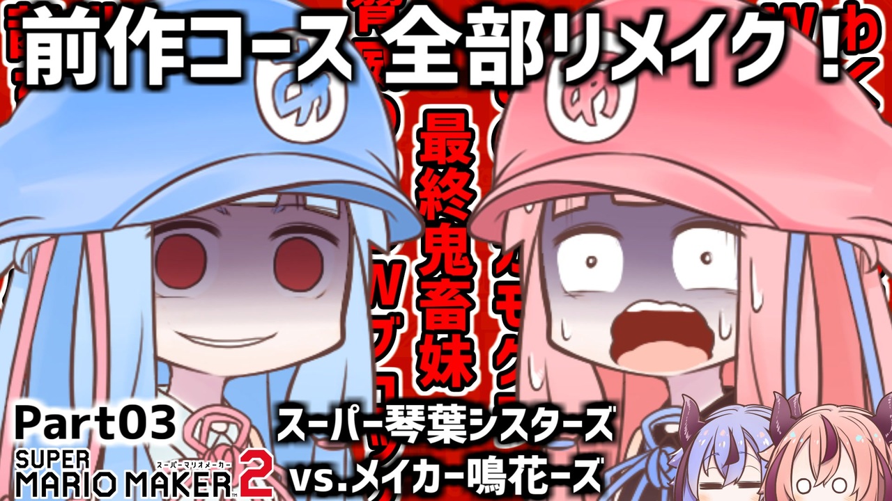 過去作からコースの引継ぎが出来ないなら全部再現すればいいじゃない(虚ろ目)<br>※今回は完全新規コースはありません。<br><br>琴葉茜と鳴花ヒメがステージ作って遊んで大暴れ!<br>琴葉葵と鳴花ミコトは解説役のような立ち回り…?<br>スーパーマリオメーカーの琴葉姉妹実況×鳴花ーズ実況をお楽しみあれ!<br><br>【今回の動画のステージ】<br>N15-938-RRF<br>B6D-QT1-RVG<br>8YJ-21L-G9G<br>Q6T-V58-RRF<br>VVS-H24-RHG<br>BST-V4B-B6G<br>SCH-G88-RRF<br>D19-JBD-BTF<br>6SD-H8W-37G<br><br>前回:<a href="https://www.nicovideo.jp/watch/sm35404389" class="watch">sm35404389</a> < <a href="https://www.nicovideo.jp/series/38664" target="_blank" rel="noopener">series/38664</a> <a href="https://www.nicovideo.jp/mylist/53166850" target="_blank" rel="noopener">mylist/53166850</a> > 次回:<a href="https://www.nicovideo.jp/watch/sm35528714" class="watch">sm35528714</a>