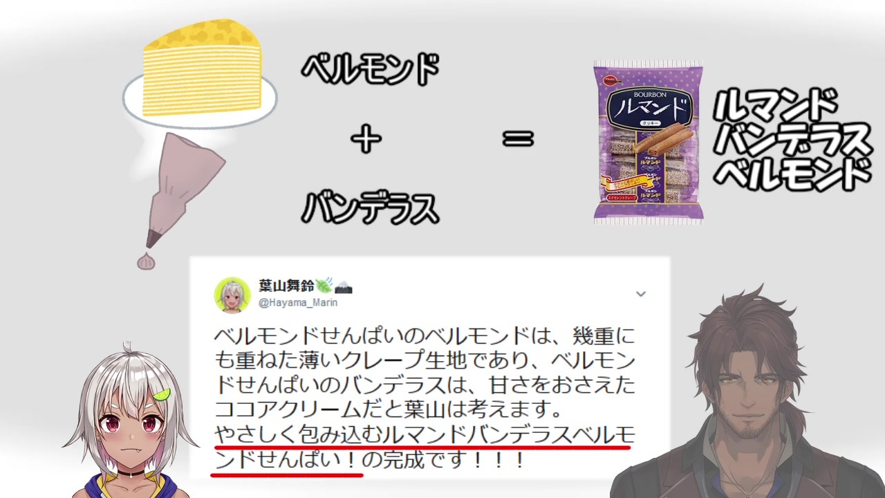 <strong>その後</strong> <a href="https://www.nicovideo.jp/watch/sm35827277" class="watch">sm35827277</a><br><br>追記:御伽原江良への誕生日プレゼント<br><a href="https://twitter.com/OtogibaraEra/status/1155774648434323456" target="_blank" rel="noopener nofollow">https://twitter.com/OtogibaraEra/status/1155774648434323456</a><br><br>ベルマンド・オイテマス<br><a href="https://twitter.com/belmond_b_2434/status/1155063118172577792" target="_blank" rel="noopener nofollow">https://twitter.com/belmond_b_2434/status/1155063118172577792</a><br>ブルボン-商品情報-ルマンド<br><a href="https://www.bourbon.co.jp/product/item?category=16&item=2603" target="_blank" rel="noopener nofollow">https://www.bourbon.co.jp/product/item?category=16&item=2603</a><br>[元動画]<br>ラジオ カレーを6人で食す<br><a href="https://twitcasting.tv/midori_2434/movie/558136990" target="_blank" rel="noopener nofollow">https://twitcasting.tv/midori_2434/movie/558136990</a><br>ベルモンド・バンデラスtwitter:<br><a href="https://twitter.com/belmond_b_2434" target="_blank" rel="noopener nofollow">https://twitter.com/belmond_b_2434</a><br>葉山舞鈴twitter:<br><a href="https://twitter.com/hayama_marin" target="_blank" rel="noopener nofollow">https://twitter.com/hayama_marin</a><br><br>使用BGM<br>【BGM・日常】Holiday<br><a href="http://commons.nicovideo.jp/material/nc123579" target="_blank" rel="noopener nofollow">http://commons.nicovideo.jp/material/nc123579</a><br /><br>ー-