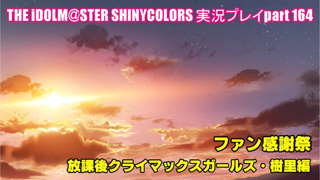 今回は、放課後クライマックスガールズ・西城樹里の【ファン感謝祭】シナリオ(後半)を鑑賞します。<br><br>オー米フレンド。<br>シチューはご飯にかけずに食べる派です。<br><br>あとサムネにアイドルいないの初めてかしら・・。<br><br> 前回 → <a href="https://www.nicovideo.jp/watch/sm35456397" class="watch">sm35456397</a><br> 次回 → <a href="https://www.nicovideo.jp/watch/sm35487332" class="watch">sm35487332</a><br><br> シャイニーカラーズ マイリスト → <a href="https://www.nicovideo.jp/mylist/61820967" target="_blank" rel="noopener">mylist/61820967</a><br><br>【動画説明】<br>・THE IDOLM@STER SHINYCOLORSを実況しながら遊んでみました。<br>・本動画には、<span style="color: #ff0000;">雑な声真似、茶番、奇声、妄想</span>等が含まれます。 <br> <span style="color: #ff0000;"><strong>苦手な方</strong></span>、<span style="color: #ff0000;"><strong>許容できない方</strong></span>は、<span style="color: #262626;">ご視聴をご遠慮</span>願います。 <br> また、<span style="color: #ff0000;"><strong>他者を不快にするコメント</strong></span><span style="color: #262626;">はご遠慮願います</span>。<br><strong>・</strong><span style="color: #ff0000;">イベントを鑑賞します</span>ので、<span style="color: #ff0000;"><strong>ネタバレ</strong></span>が嫌な方も、ご視聴はお控えください。<br>・誤った知識や発言等がございましたら、<span style="color: #262626;">やんわりと</span>コメント等でご指摘頂けると助かります。<br>・動画編集及びゲームの腕前は<span style="color: #262626;">大変残念</span>です。温かい目で見て頂ければ幸いです。<br>・動画投稿は不定期です。週に2本くらい投稿したいとは思っています。<br>・プレイヤー:みっどんP <br>・ツイッター: <a href="https://twitter.com/midvalley_midon" target="_blank" rel="noopener nofollow">https://twitter.com/midvalley_midon</a> (更新報告など)<br><span style="color: #000000;">・コミュニティ:</span><span style="color: #006699;">co3766379</span>