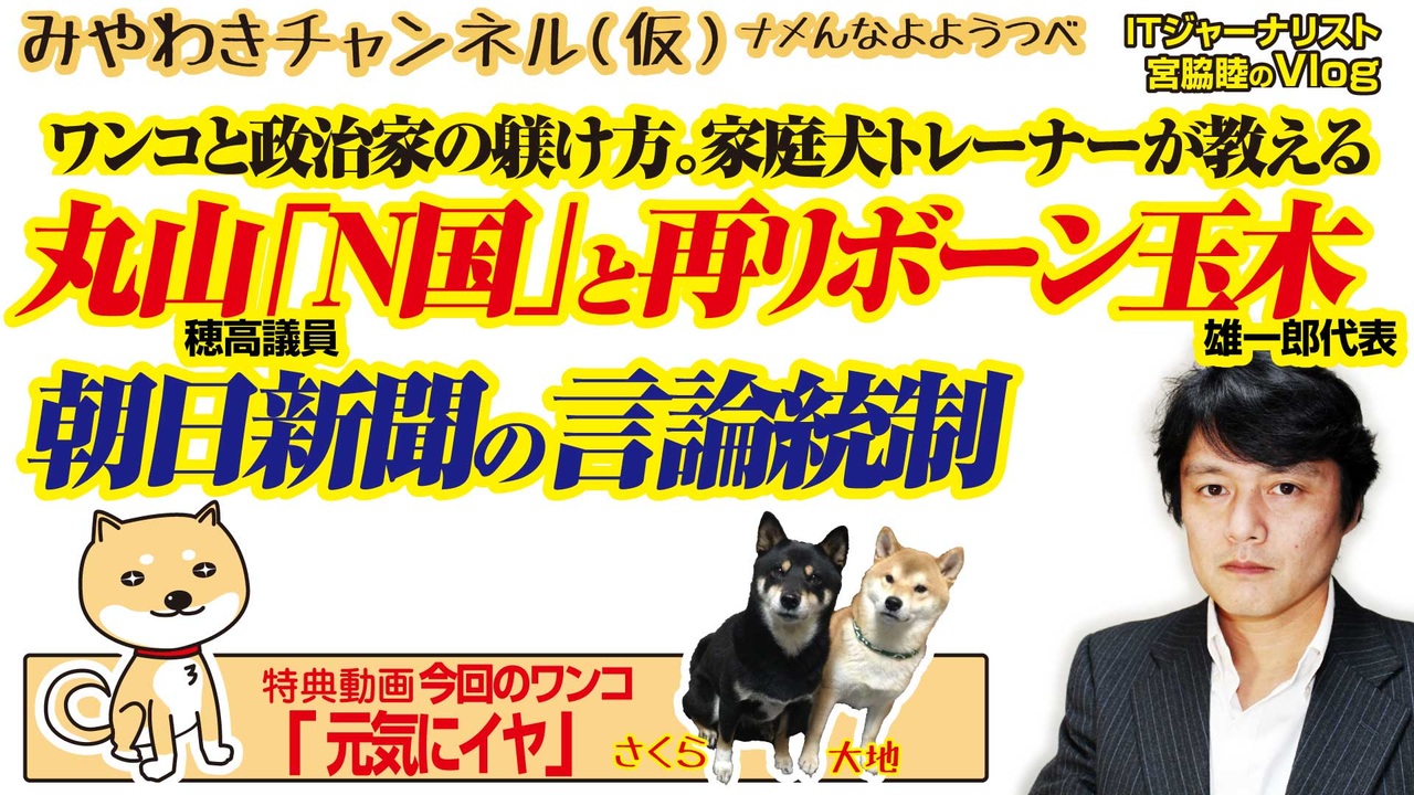 丸山穂高衆院議員「N国党」入りと朝日新聞の言論統制体質。<br>リボーン玉木雄一郎代表をホメた理由。<br>トレーナーが教えるワンコと政治家の育て方。<br><br>0:07 つくづく「思想統制」が大好きな朝日新聞<br>2:46 議論させない花畑オッス工作員<br>4:33 お医者さんが丸山さんをSNSチェック<br>7:18 後ろ足で砂をかける議員、感謝を語る芸人<br>10:35 玉木代表をホメた理由は家庭犬トレーナー<br>13:42 今回のワンコ「元気にイヤ」<br><br>みやわきチャンネル(仮)#528Restart387<br><br>(旧・マスコミでは言えないこと)<br>オリジナル2019年7月30日配信<br><br>番組の最後に「柴犬」のコーナーがあります。<br>今回のワンコ「元気にイヤ」<br><br>■わんこ総集編はこちらから!<br>何かあっても大丈夫、のはず。仮にこの「ワンコチャンネル」になにかあれば・・・オッス、○○と。<br>今回のワンコ総集編〜さくら&大地〜<br><a href="https://www.youtube.com/channel/UChwY..." target="_blank" rel="noopener nofollow">https://www.youtube.com/channel/UChwY...</a><br><br>■ニコニコ動画<br><a href="http://www.nicovideo.jp/user/13610165" target="_blank" rel="noopener nofollow">http://www.nicovideo.jp/user/13610165</a><br>■FRESH LIVE<br><a href="https://freshlive.tv/miyawaki-ch" target="_blank" rel="noopener nofollow">https://freshlive.tv/miyawaki-ch</a><br>■FC2動画<br><a href="https://video.fc2.com/account/16696711" target="_blank" rel="noopener nofollow">https://video.fc2.com/account/16696711</a><br>■YouTube(理不尽に消えることあり)<br><a href="https://www.youtube.com/c/AtsushiMiyawaki" target="_blank" rel="noopener nofollow">https://www.youtube.com/c/AtsushiMiyawaki</a><br><br>■いつ「消える」かわかりません。<br>そこでオフィシャルサイトで「非常用連絡先」をご確認ください。<br>「みやチャン(仮)」公式サイト「MiyawakiNewsNetwork」<br><a href="http://www.miyawakiatsushi.net" target="_blank" rel="noopener nofollow">http://www.miyawakiatsushi.net</a><br><br>■理不尽に消えたとき、以下で情報配信しております。ぜひ、ご登録ください。<br><br>■ツイッター<br><a href="https://twitter.com/miyawakiatsushi" target="_blank" rel="noopener nofollow">https://twitter.com/miyawakiatsushi</a><br>■Facebook<br><a href="https://www.facebook.com/miyawakiatsushi" target="_blank" rel="noopener nofollow">https://www.facebook.com/miyawakiatsushi</a>